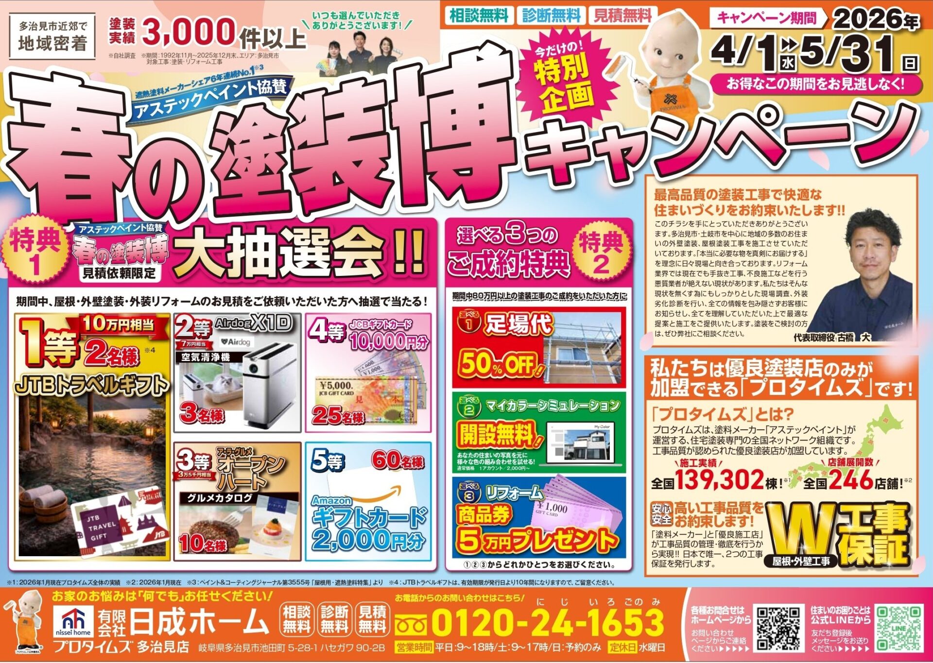 今だけの特別企画!! 多治見市・土岐市・瑞浪市にお住まいの皆様に 嬉しいお知らせ!! 「春の塗装博キャンペーン」2026年4月1日(水)〜5月31日(日)開催。見積依頼でJTBトラベルギフト10万円相当などが、合計100名様に当たるチャンス。 「春の塗装博キャンペーン」2026年4月1日(水)〜5月31日(日)開催。見積依頼でJTBトラベルギフト10万円相当などが、合計100名様に当たるチャンス。