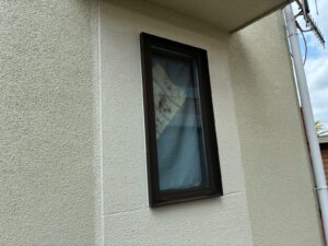 外壁の中塗り塗装です。アステックペイントの超低汚染プラチナリファイン2000MFで塗り替えです。紫色ぽっく見えますが、茶系です。乾くと茶系になっていきます。