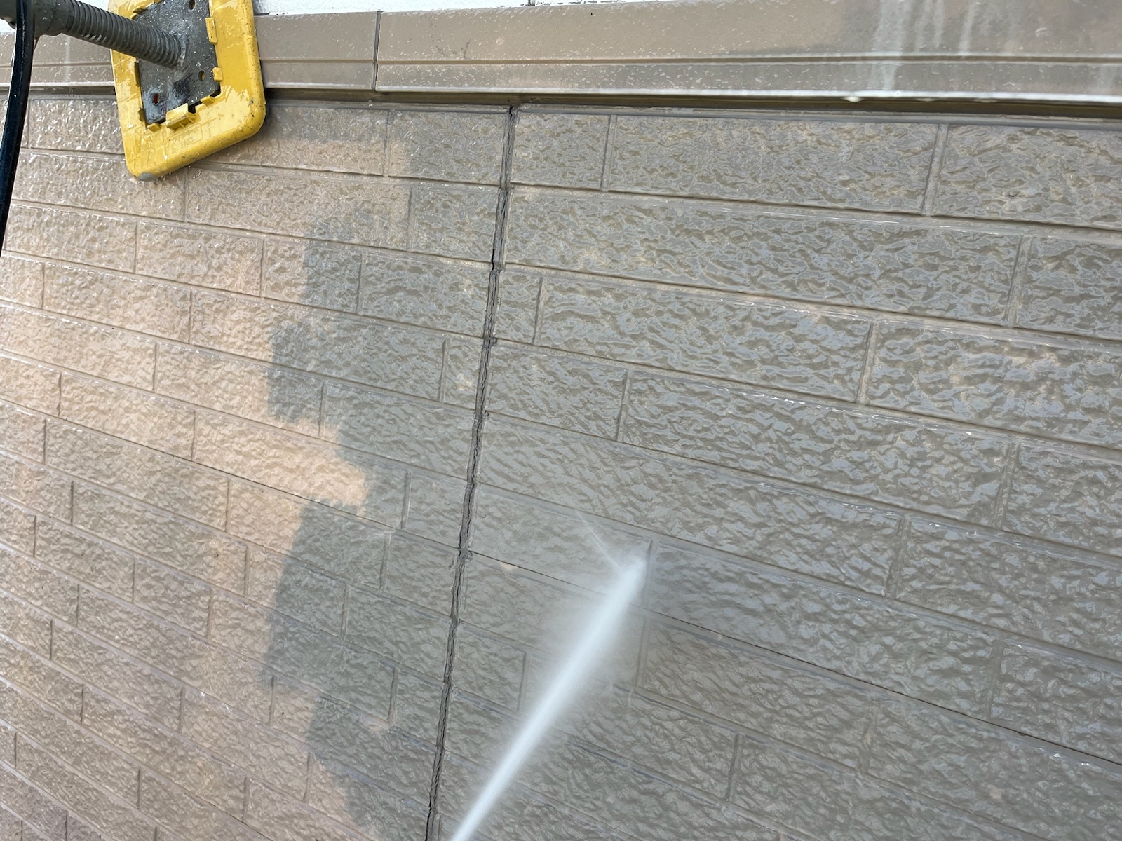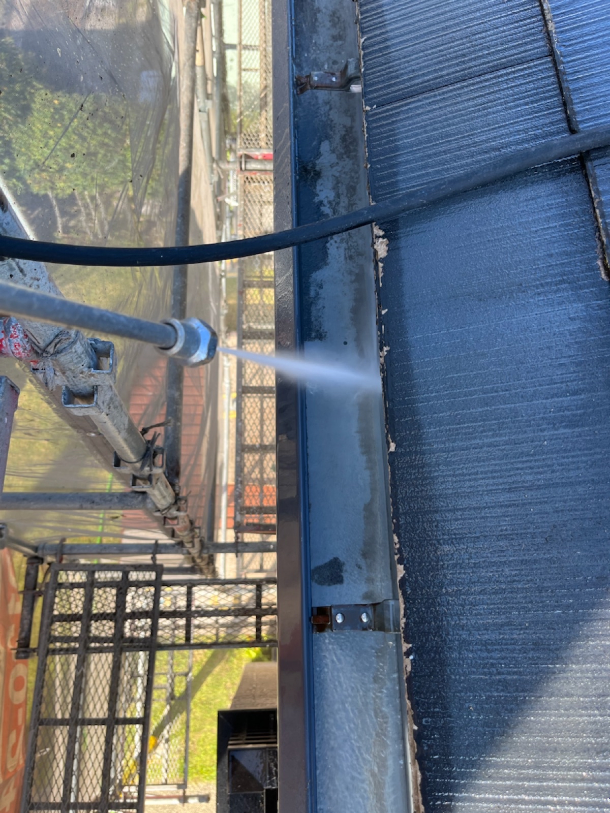 外壁の洗浄です。バイオ液でバイオ洗浄をおこない、もう一度お水で洗い流します。