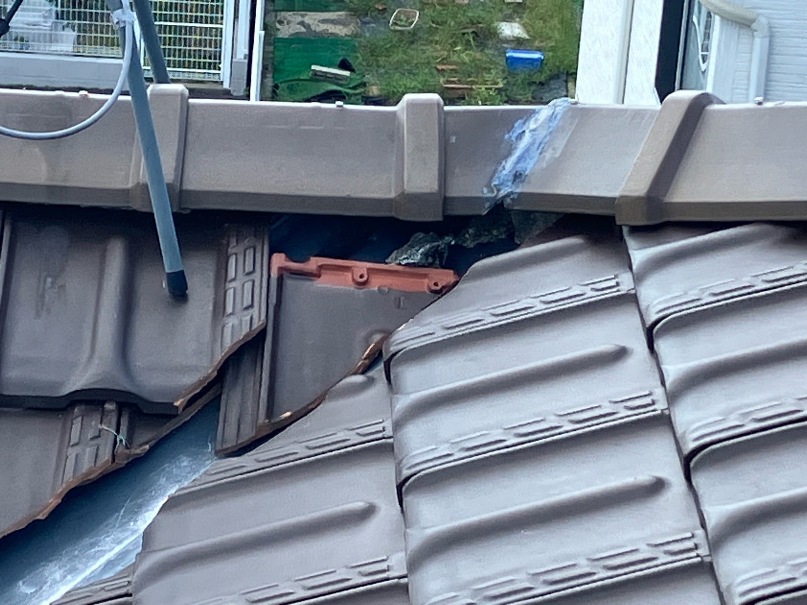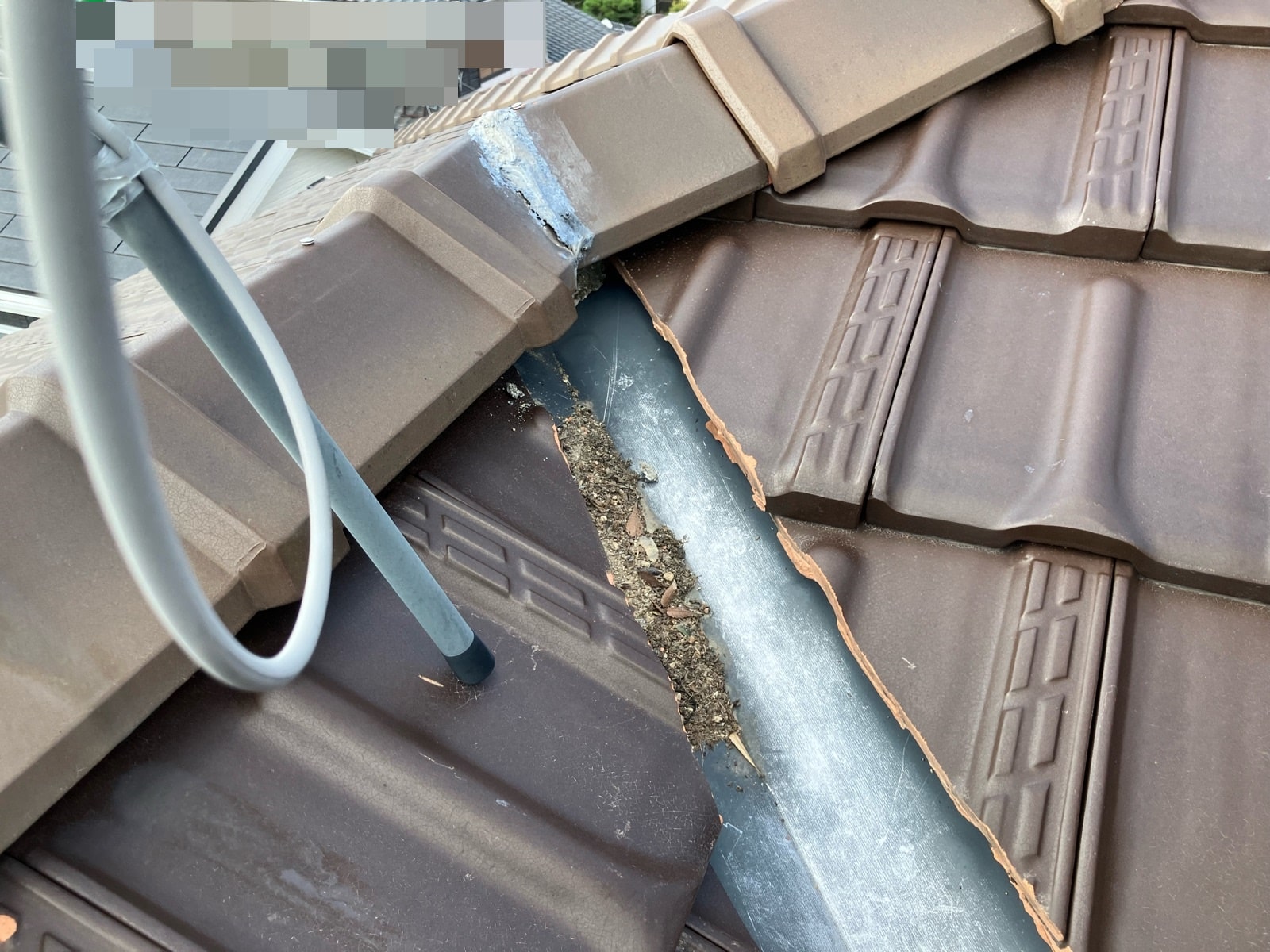 • 谷樋の状態です。雨水の通り道を塞いでいます。たくさん雨が降ると、谷樋に雨水が流れていない可能性があります。
