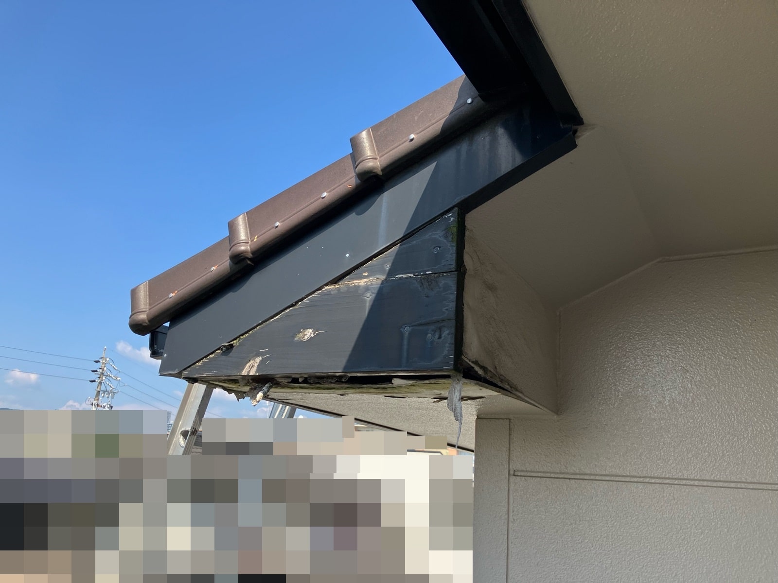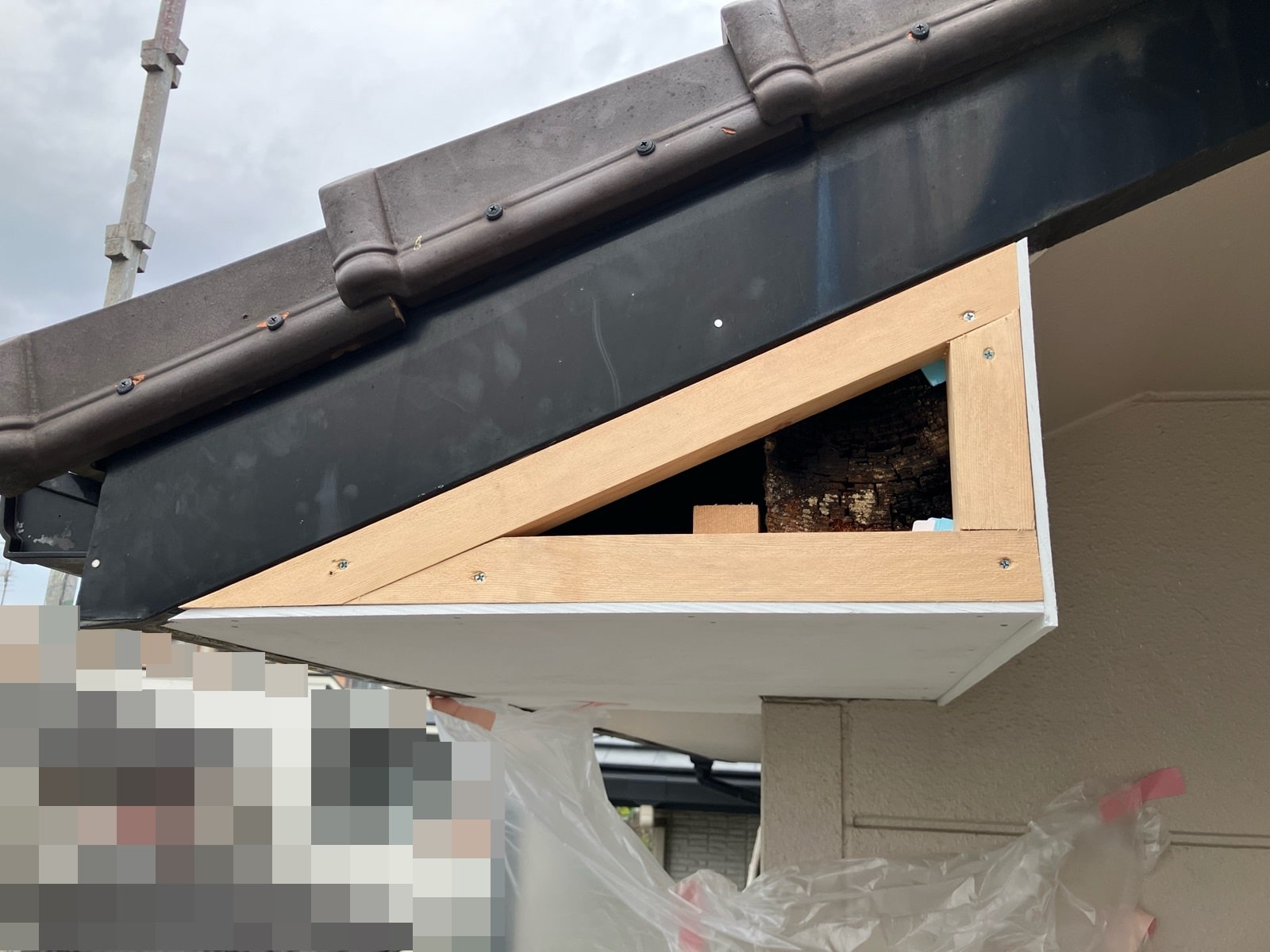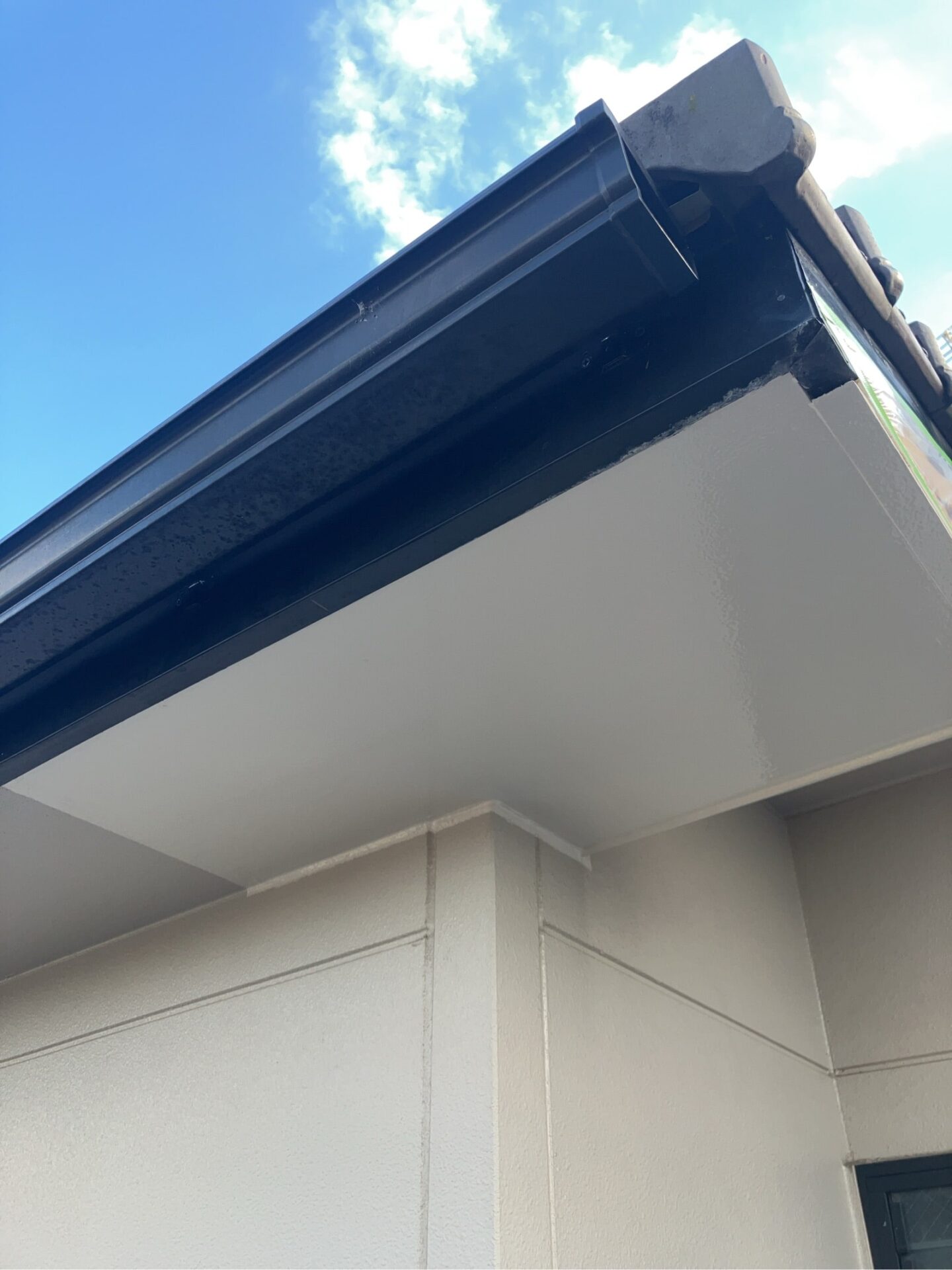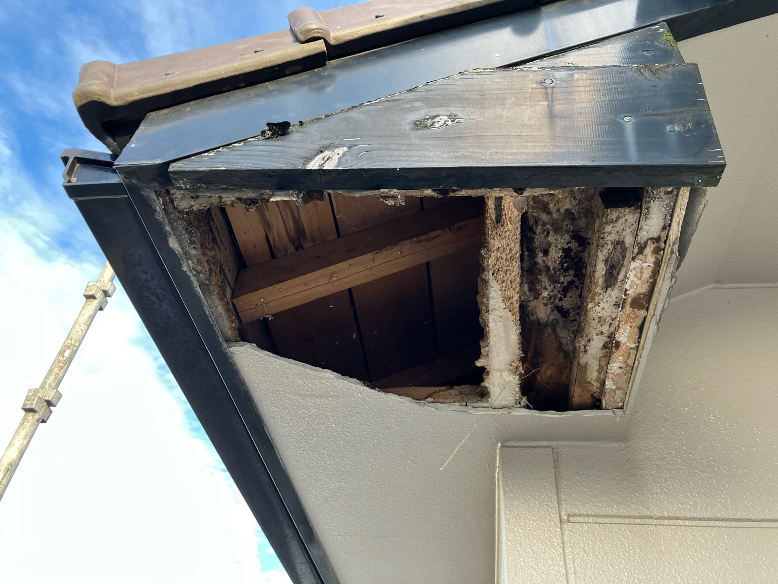 谷樋に雨水が流れるように屋根の補修もおこない、腐食した破風、軒天井部分は撤去して張替え、塗装しました!
