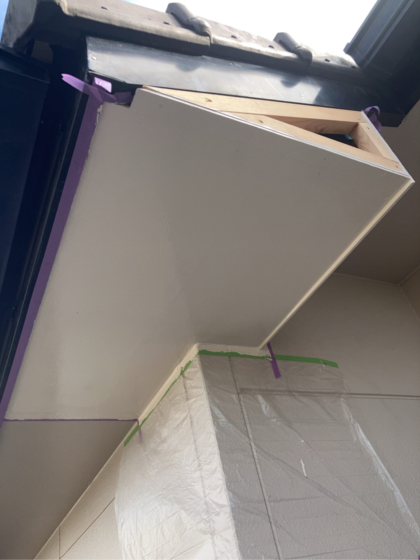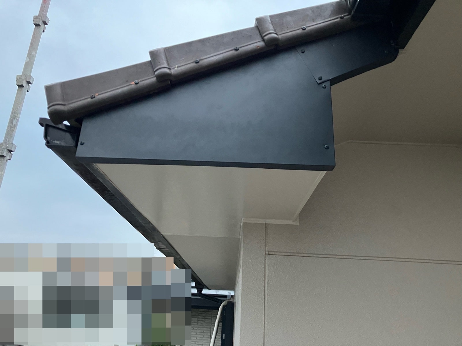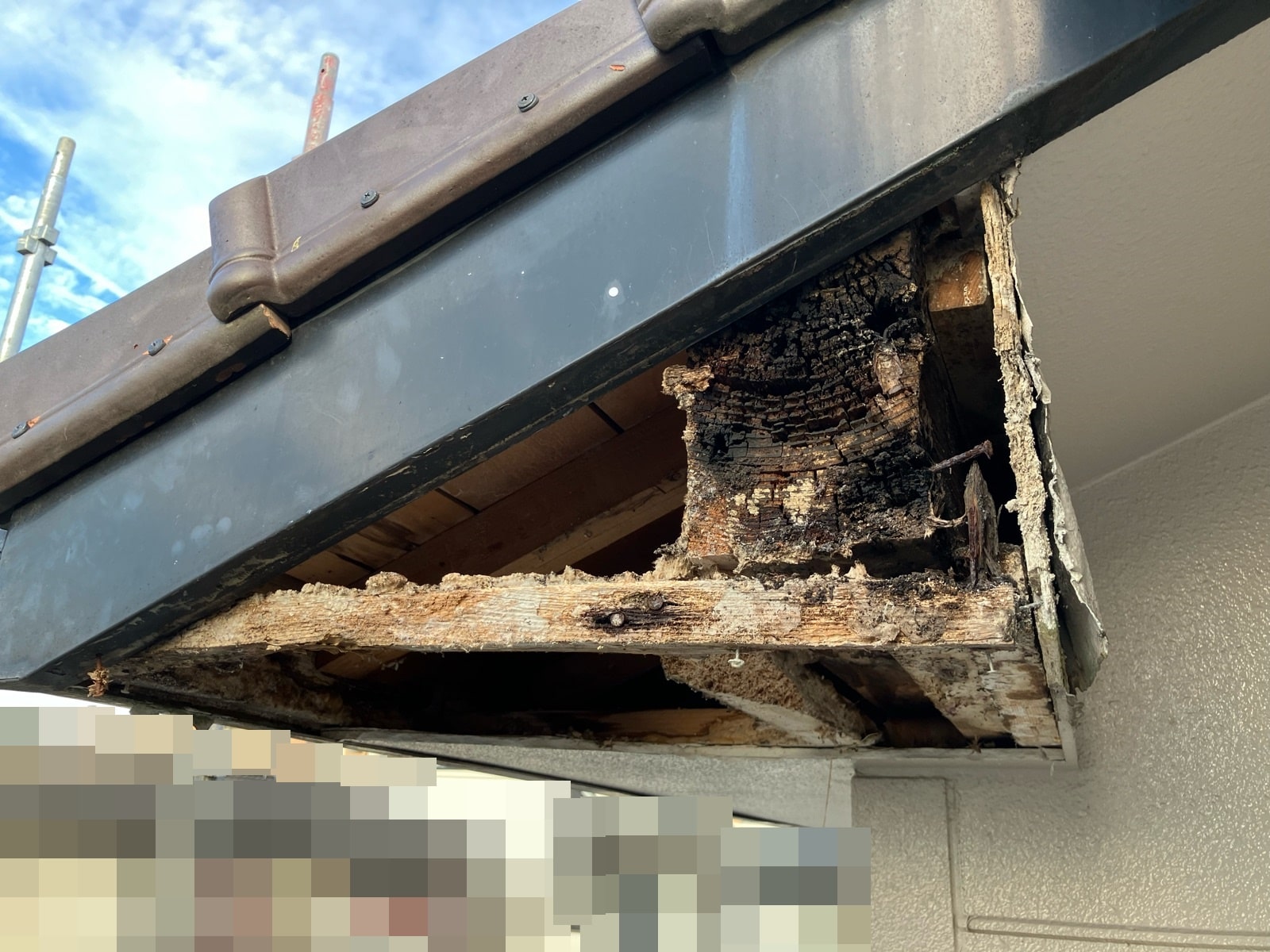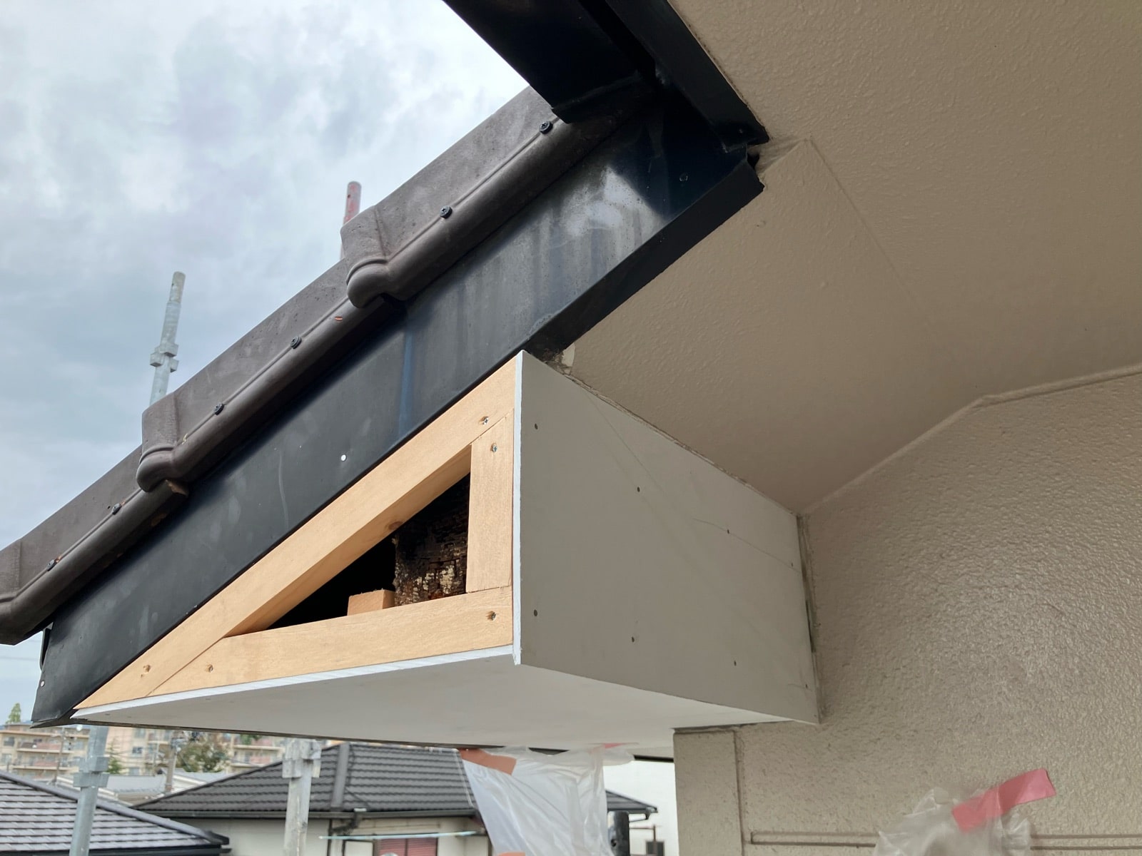 谷樋に雨水が流れるように屋根の補修もおこない、腐食した破風、軒天井部分は撤去して張替え、塗装しました!