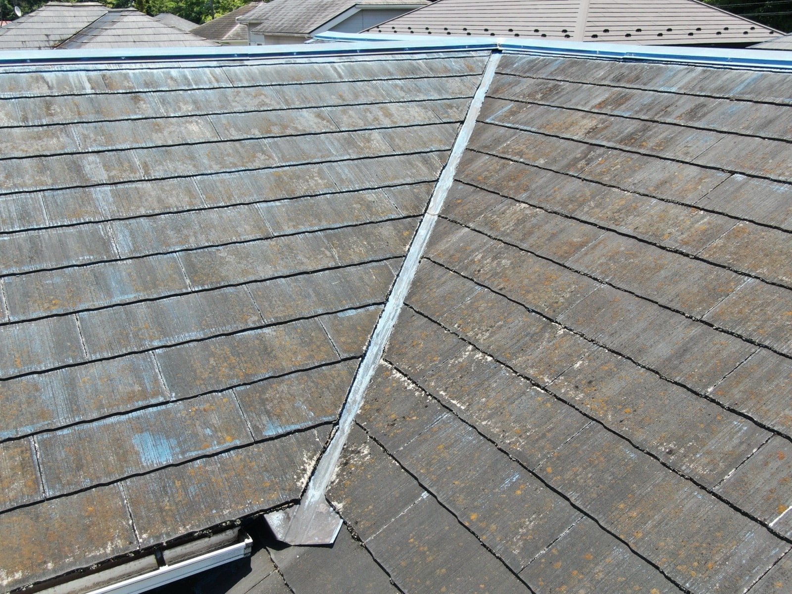 屋根の状態 屋根全体に汚れ、苔が見受けられます。棟板金が浮いているような箇所は見受けられませんでした。軽度な錆が見受けられます。
