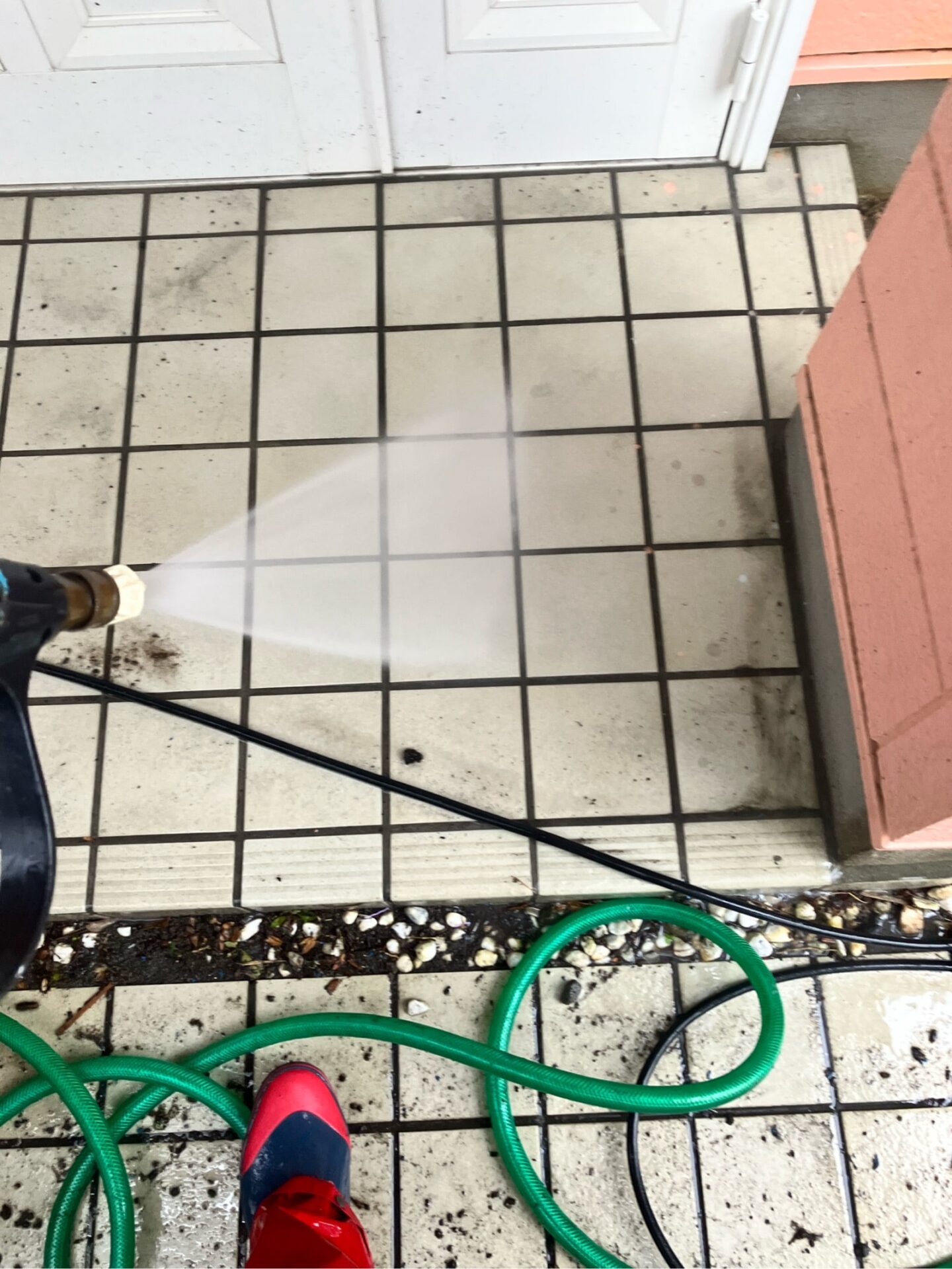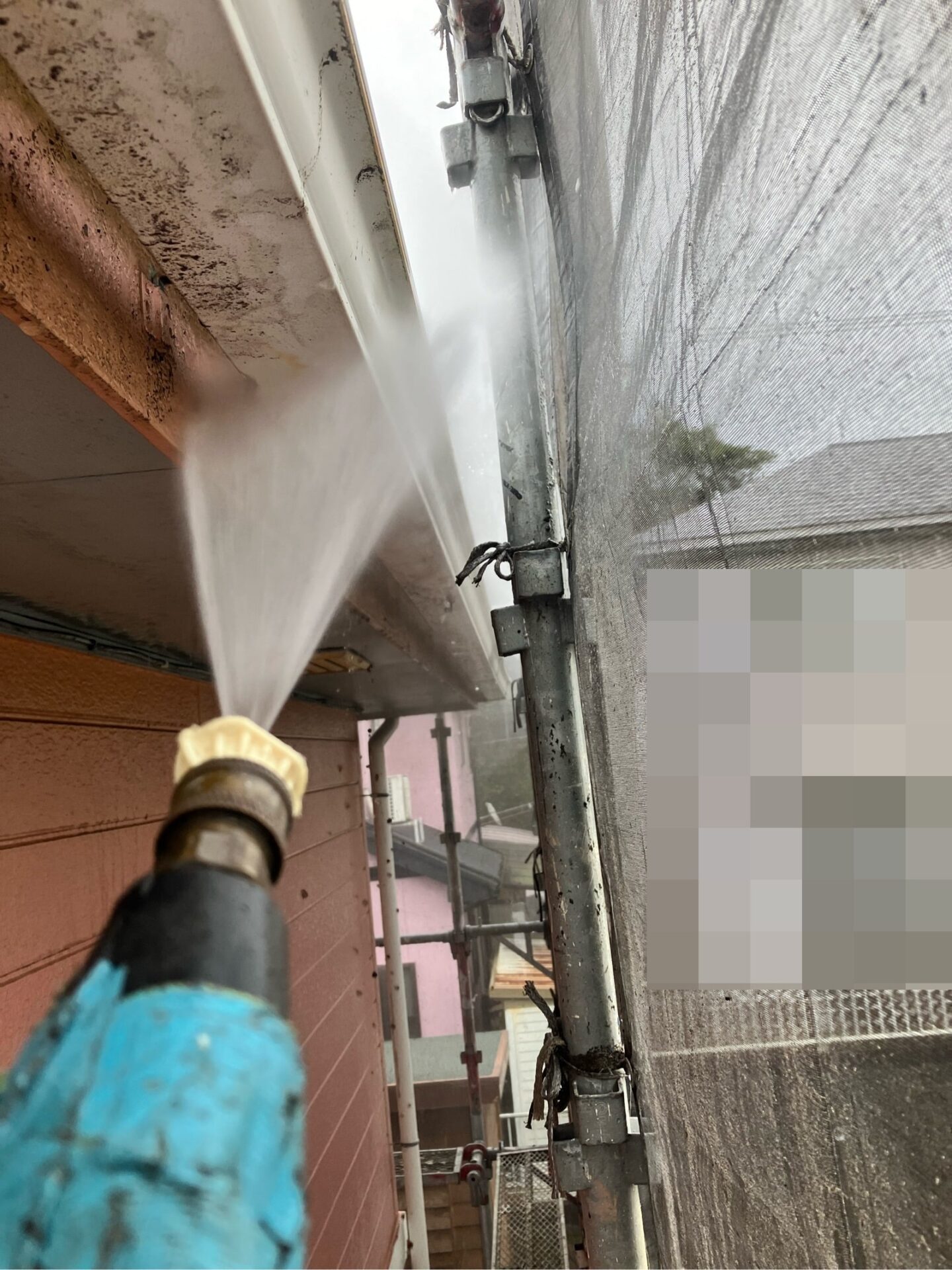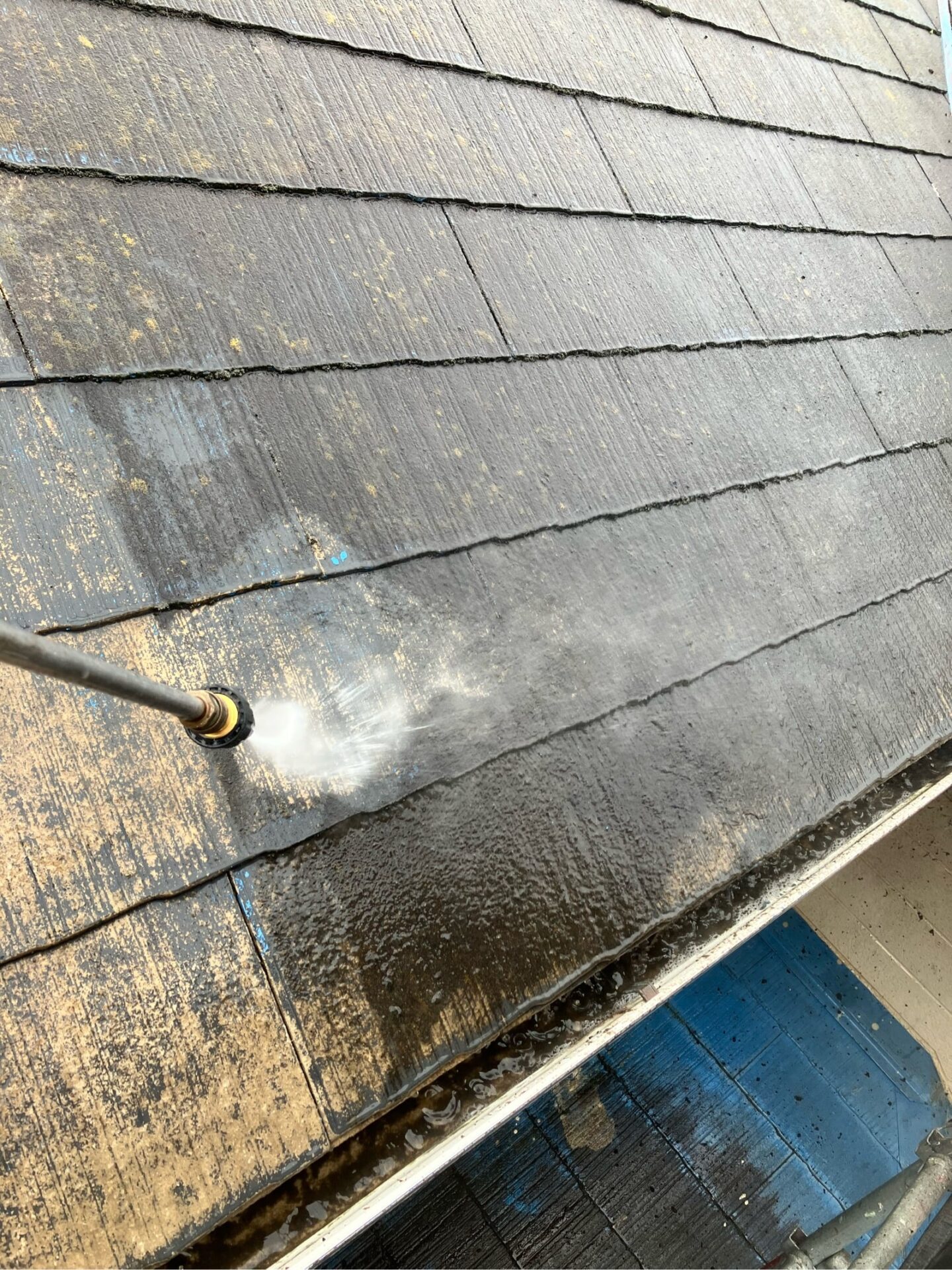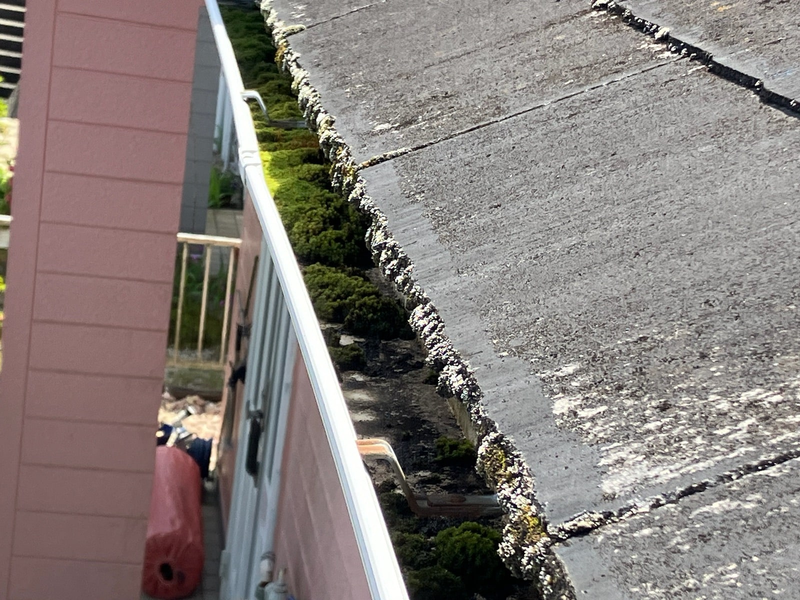 軒先には、苔の発生が多くみられ、樋の中は汚れております。下屋根の軒樋の中は一部苔の滞留が見受けられます。高圧洗浄時にきれいに洗い流していきます。