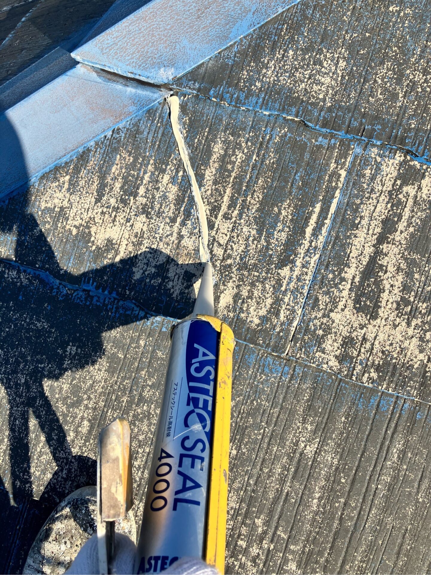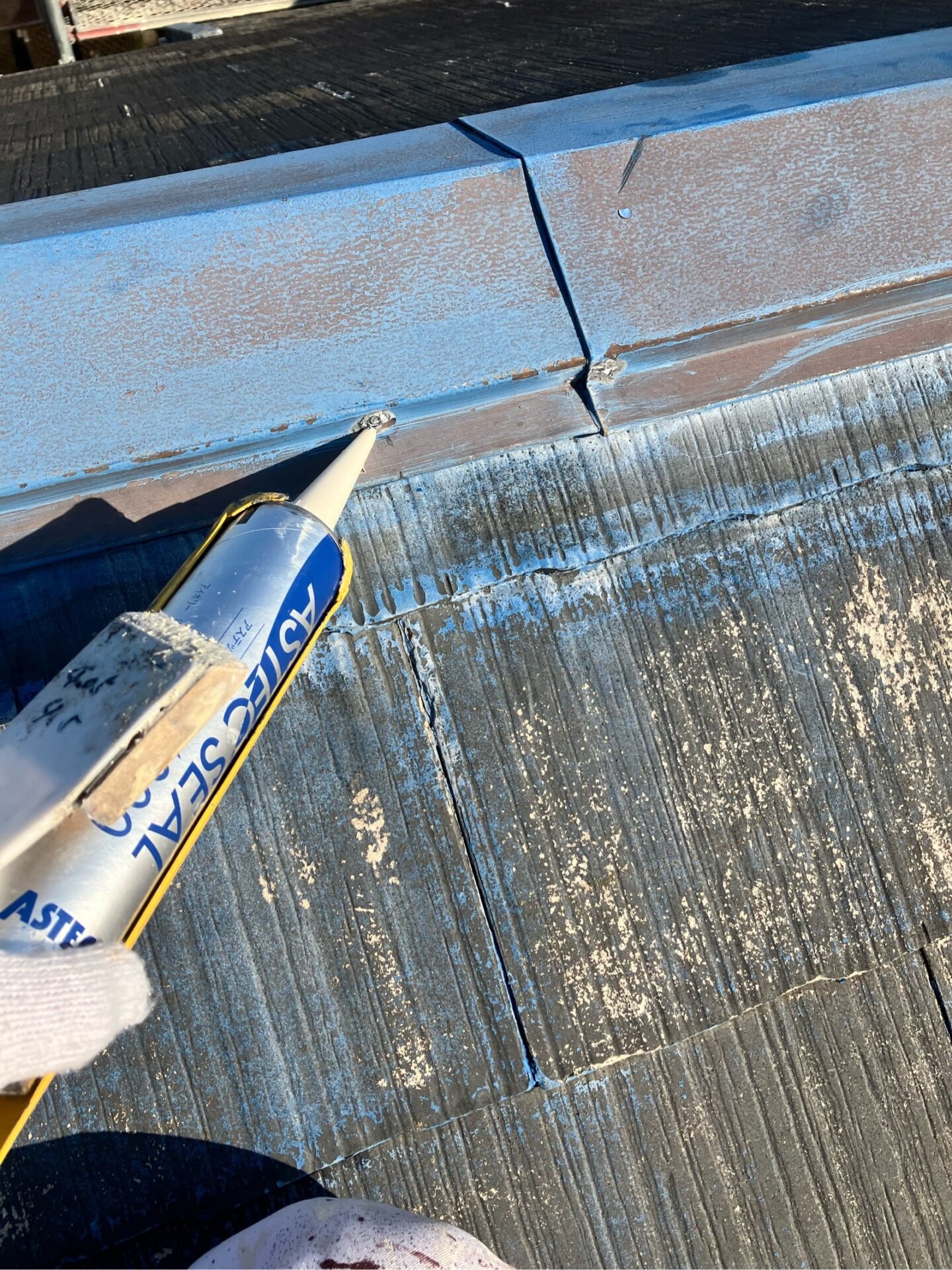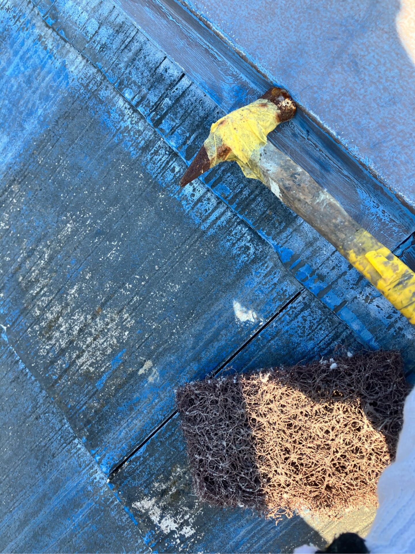 棟板金の飛び出た釘を打ち込んでおります。打ち込みが終わったらコーキングします。