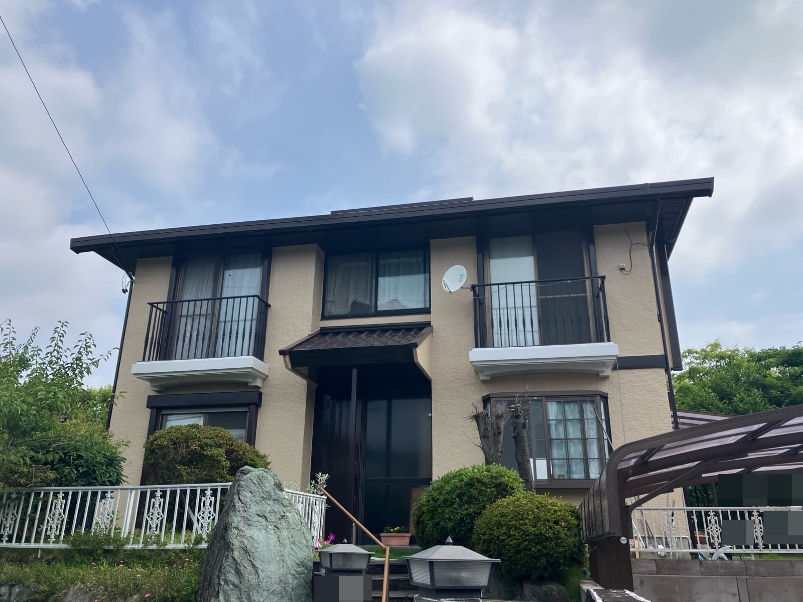 屋根には落ち着いた「ラッセットブラウン」、外壁には優しい「ミッドビスケット」を選定。お住まい全体の雰囲気がパッと明るく、上品に仕上がりました。