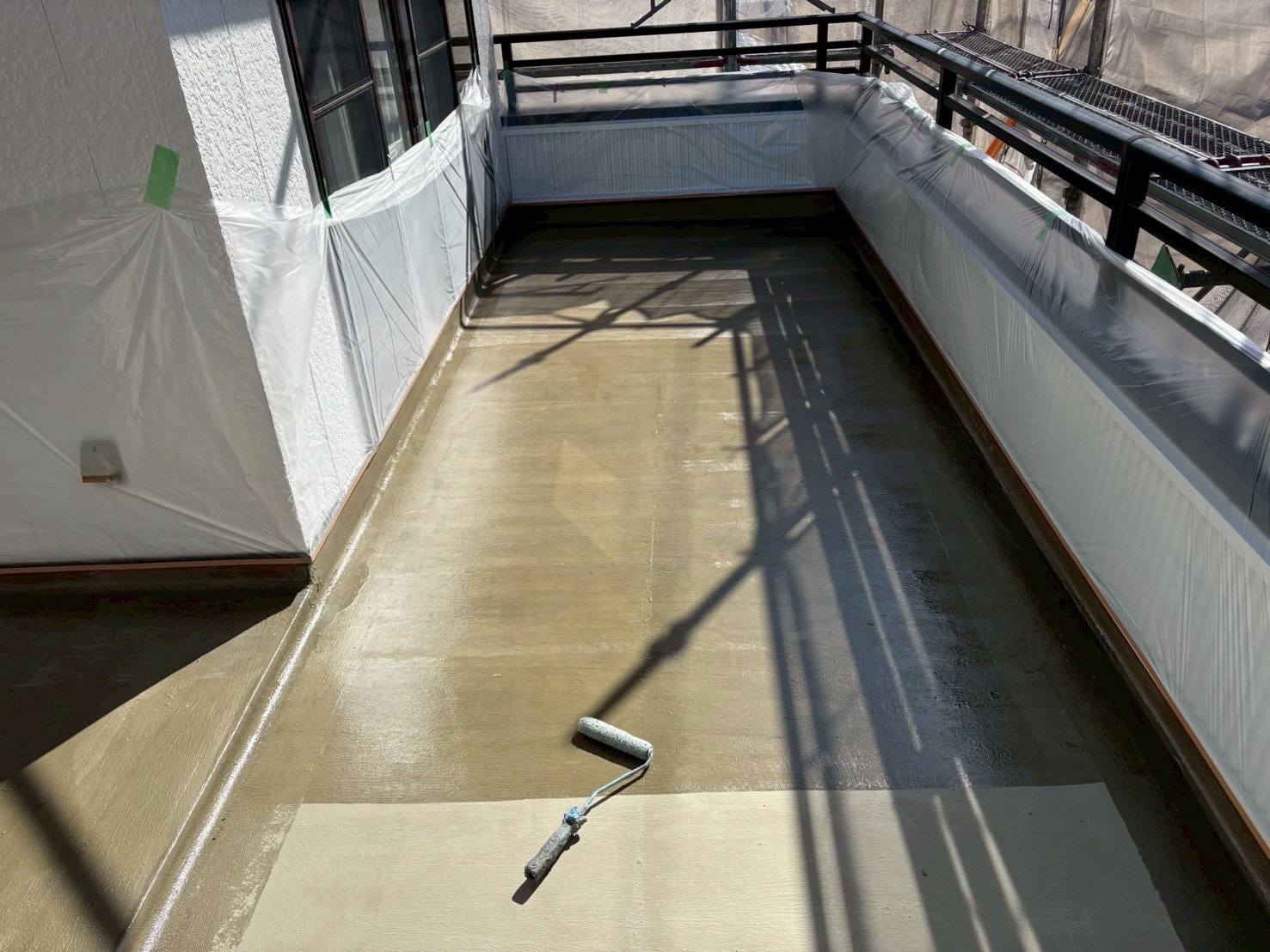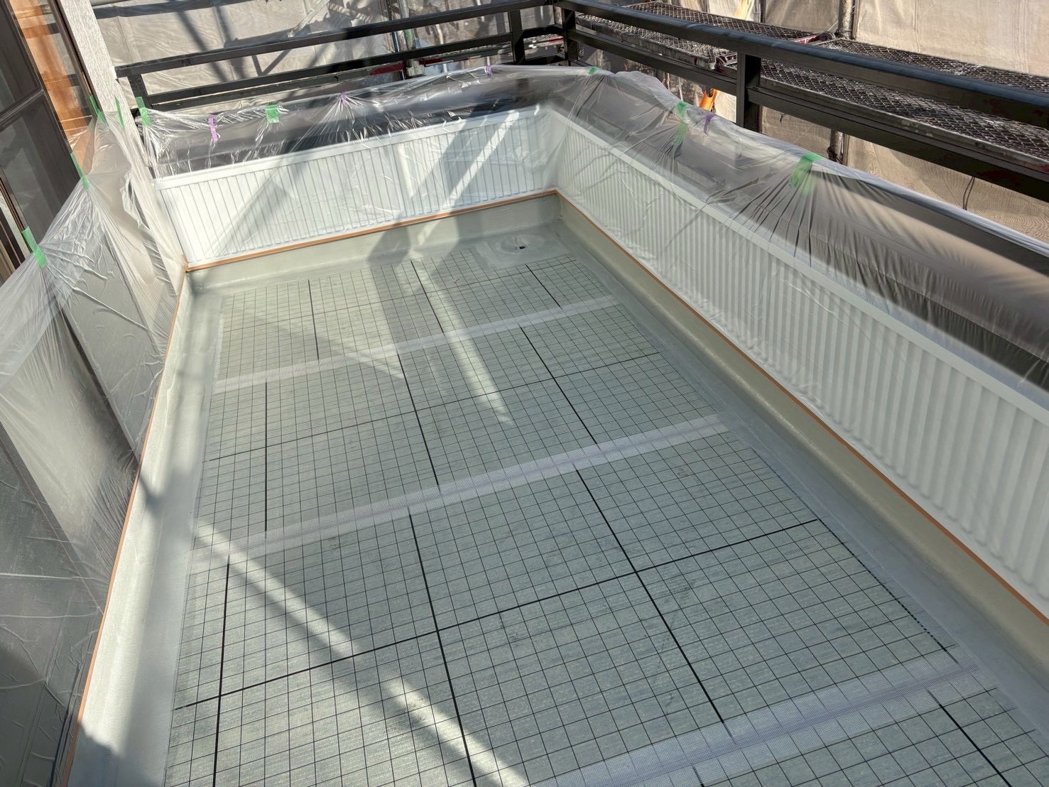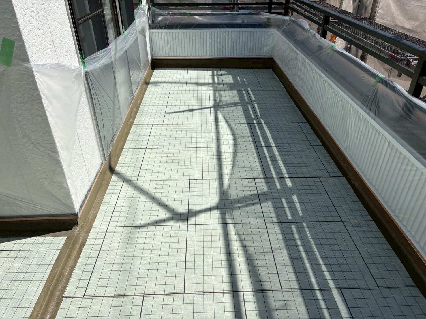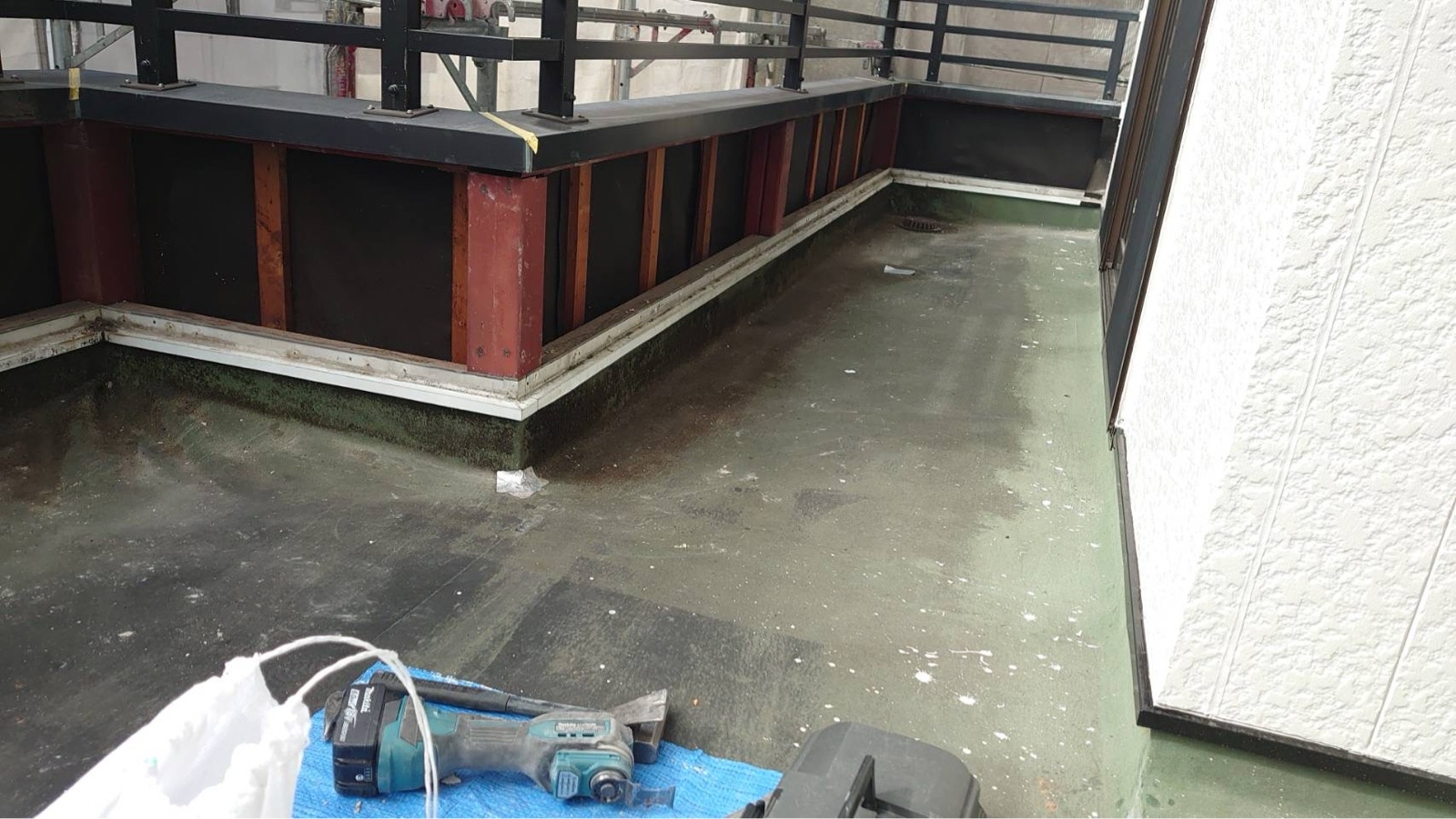 ベランダ部分は雨漏りのリスクが高い箇所であるため、今回は表面の防水塗装(ウレタン防水)だけでなく、壁面にカバー工法を施すことで防水性能を根本から強化しています。