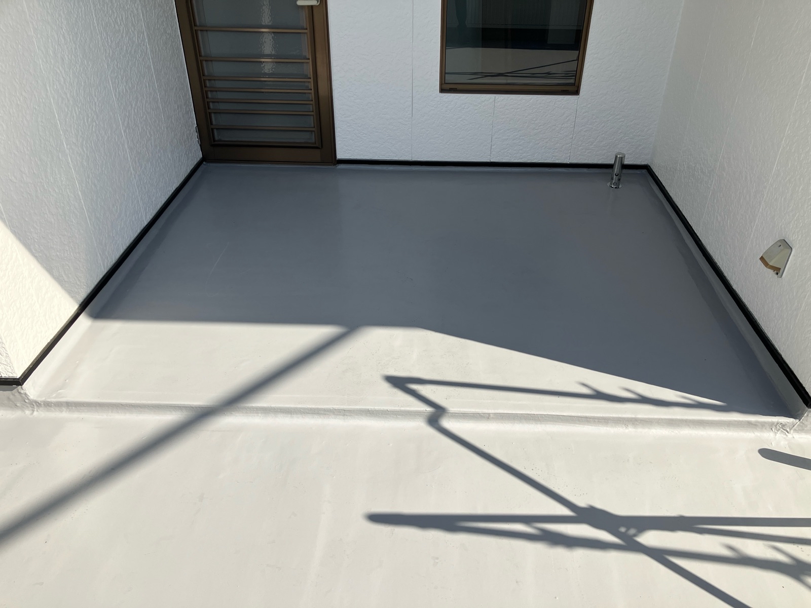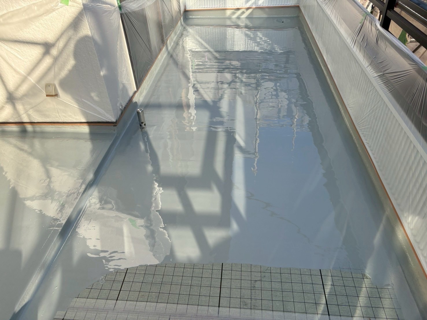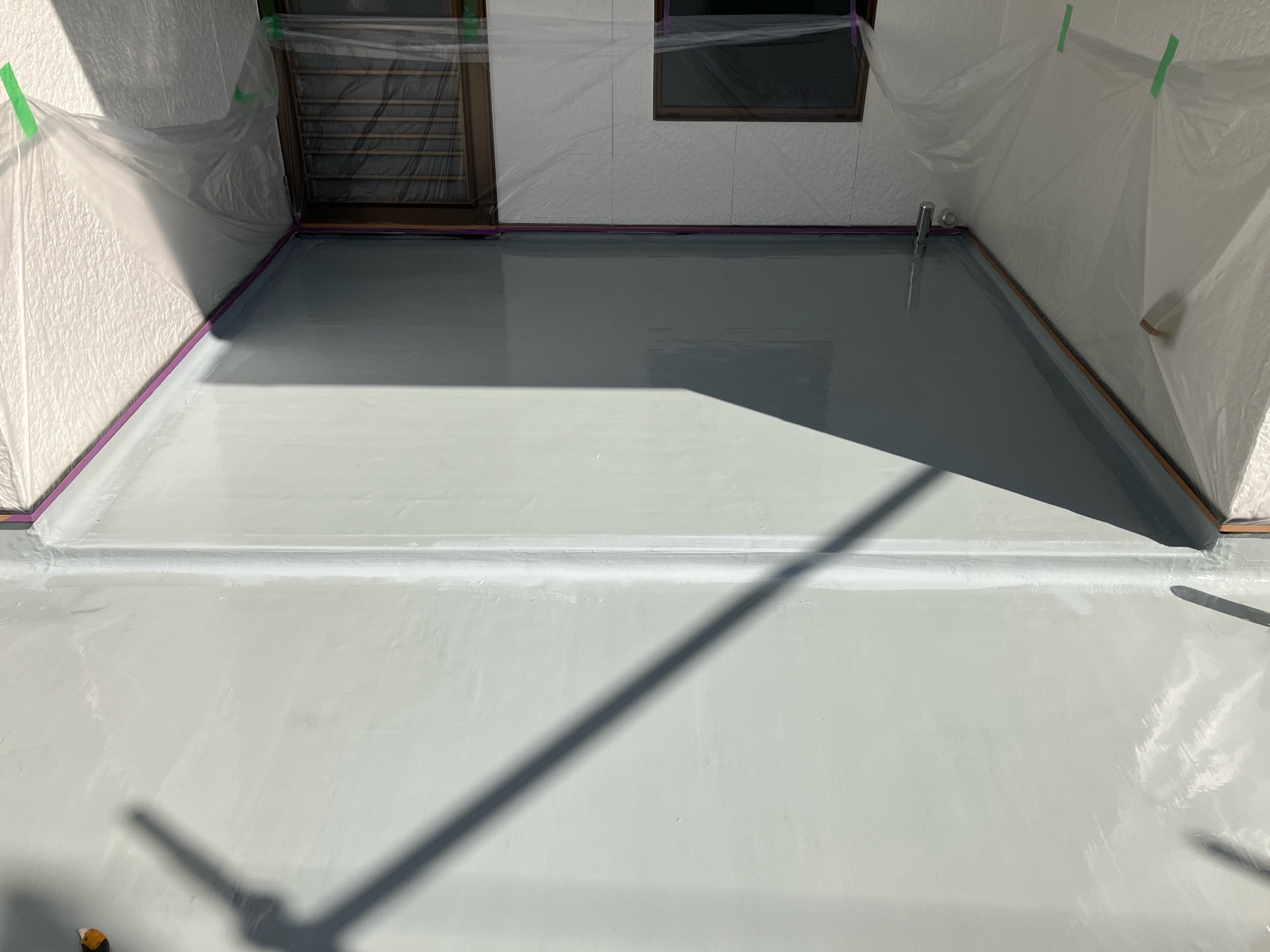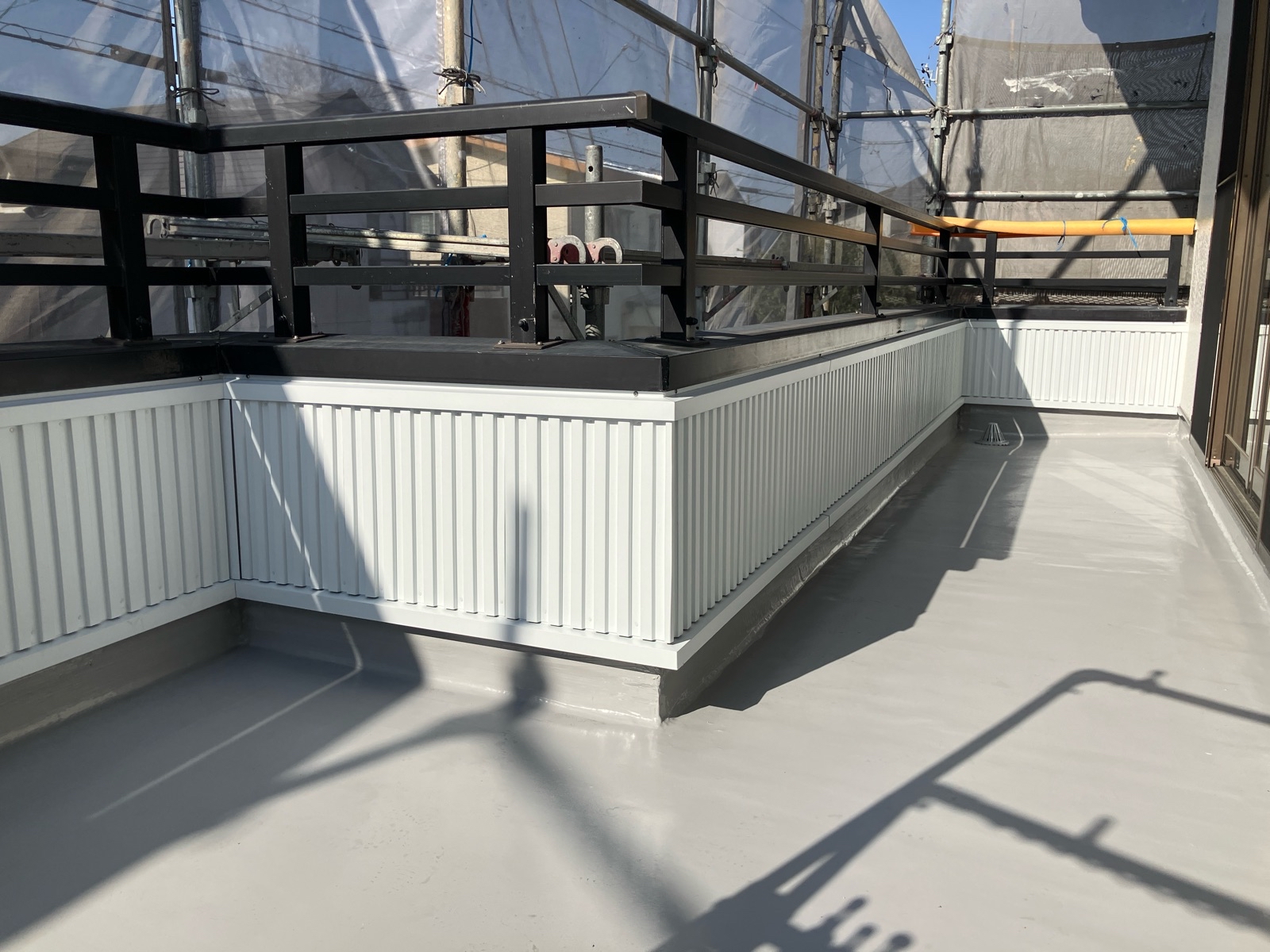 ベランダ部分は雨漏りのリスクが高い箇所であるため、今回は表面の防水塗装(ウレタン防水)だけでなく、壁面にカバー工法を施すことで防水性能を根本から強化しています。