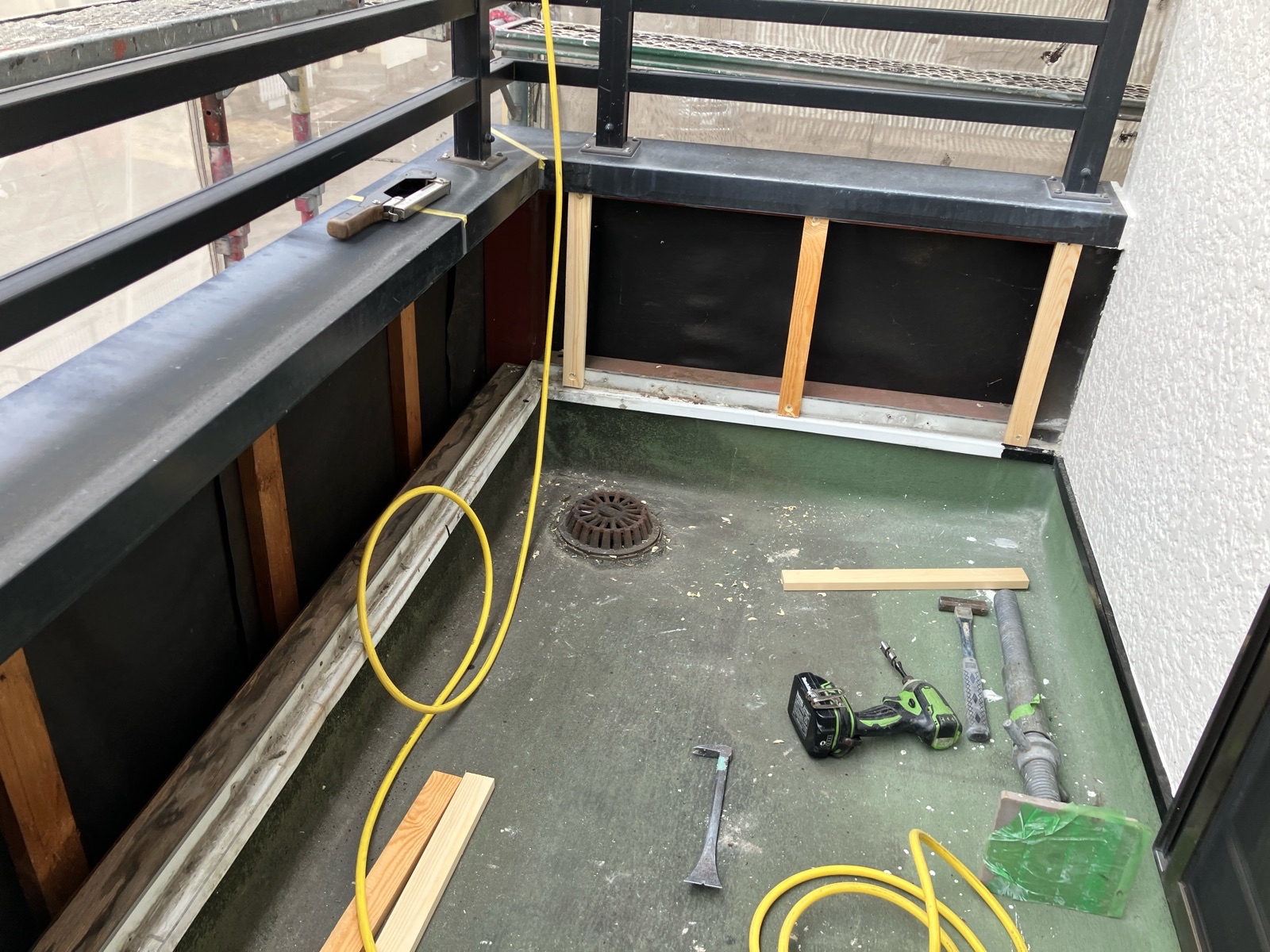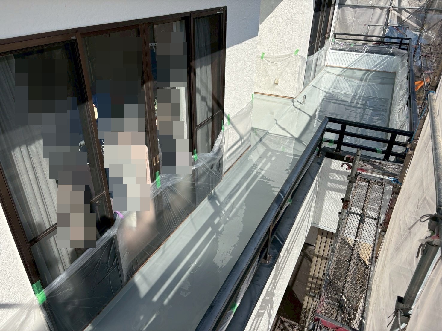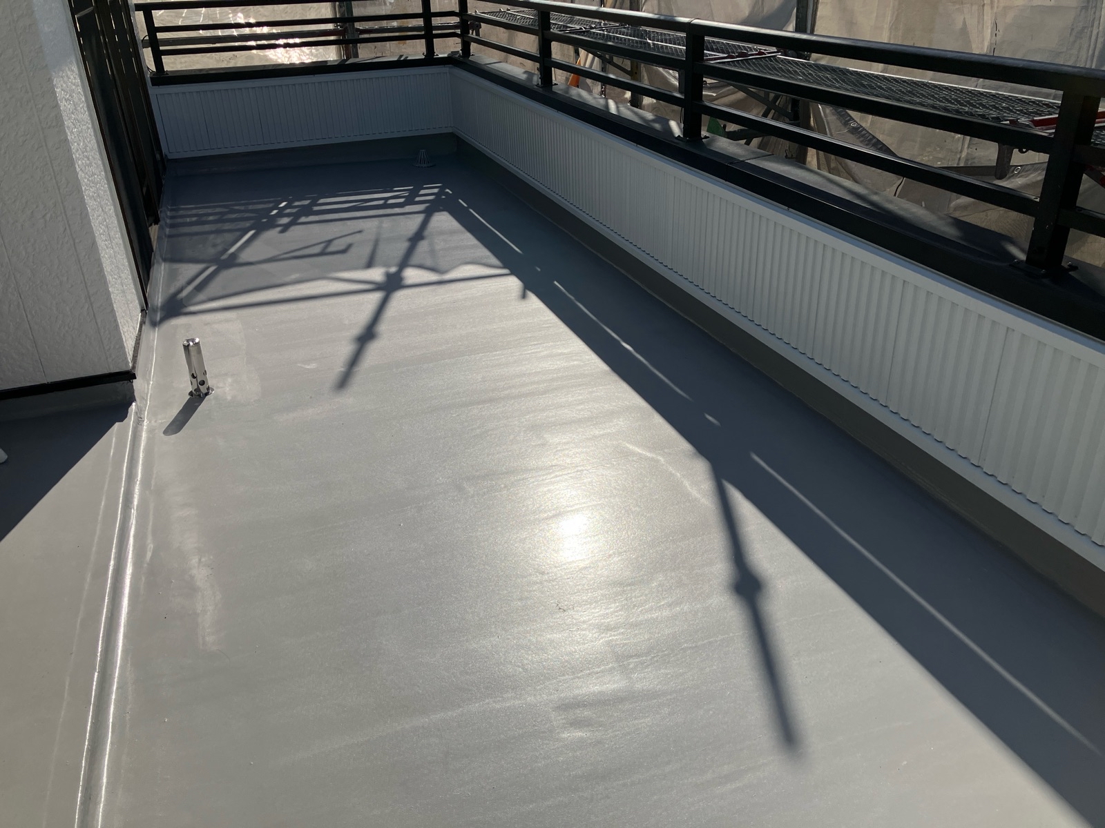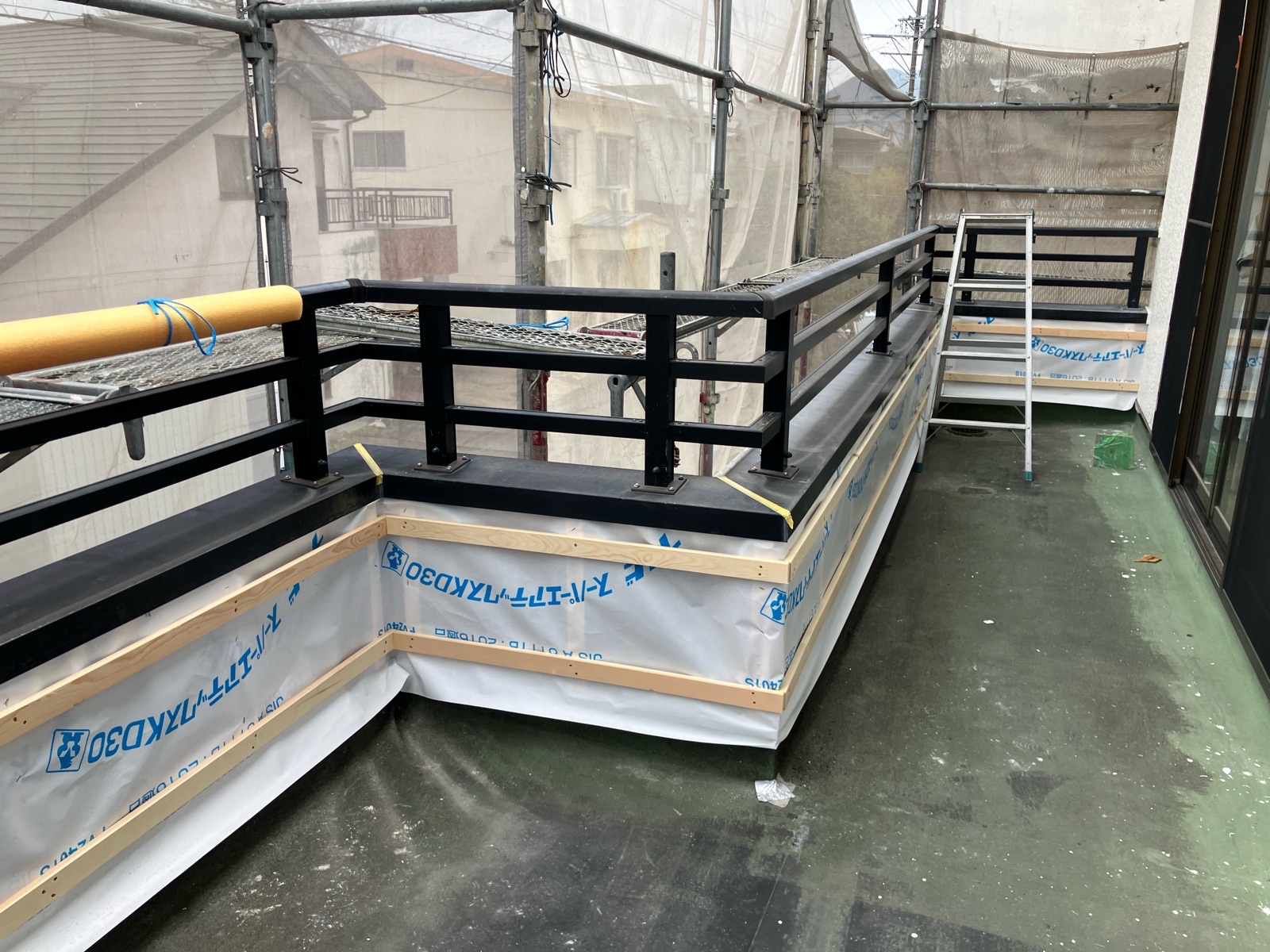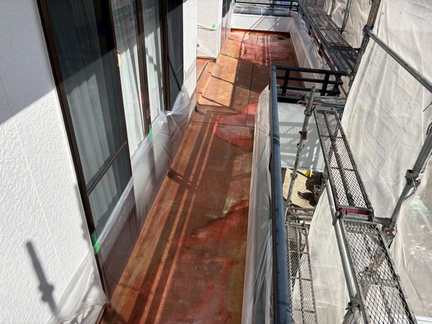 ベランダ部分は雨漏りのリスクが高い箇所であるため、今回は表面の防水塗装(ウレタン防水)だけでなく、壁面にカバー工法を施すことで防水性能を根本から強化しています。