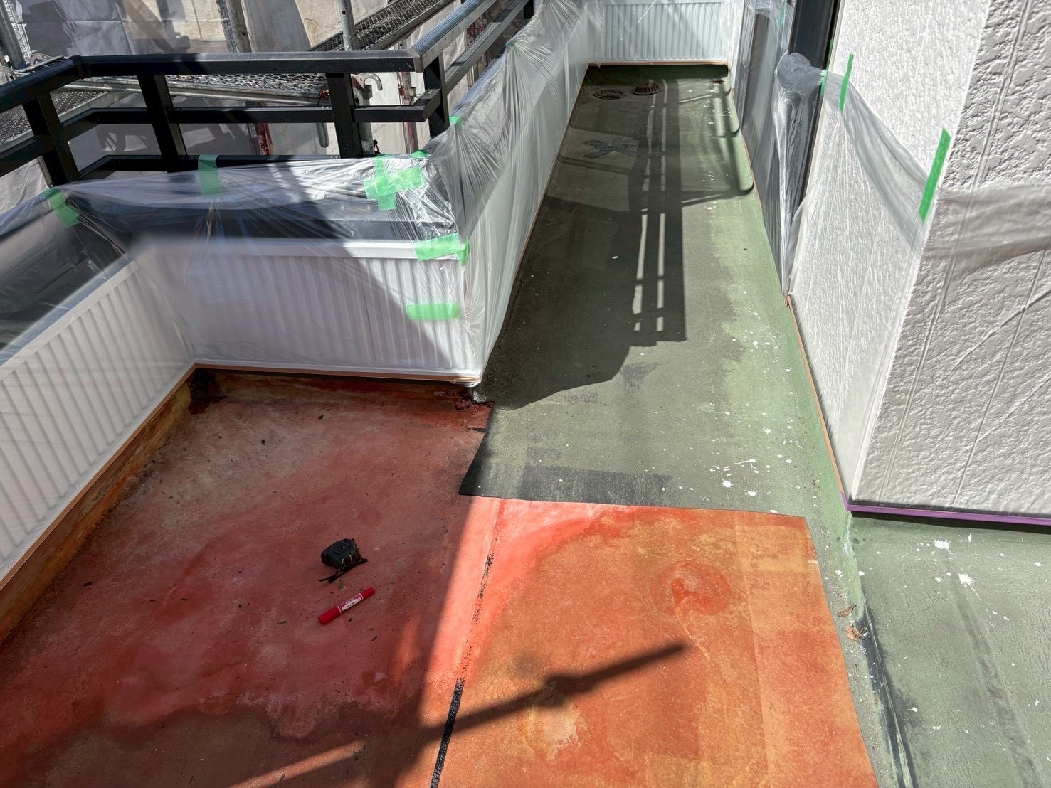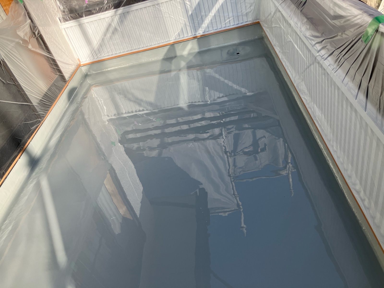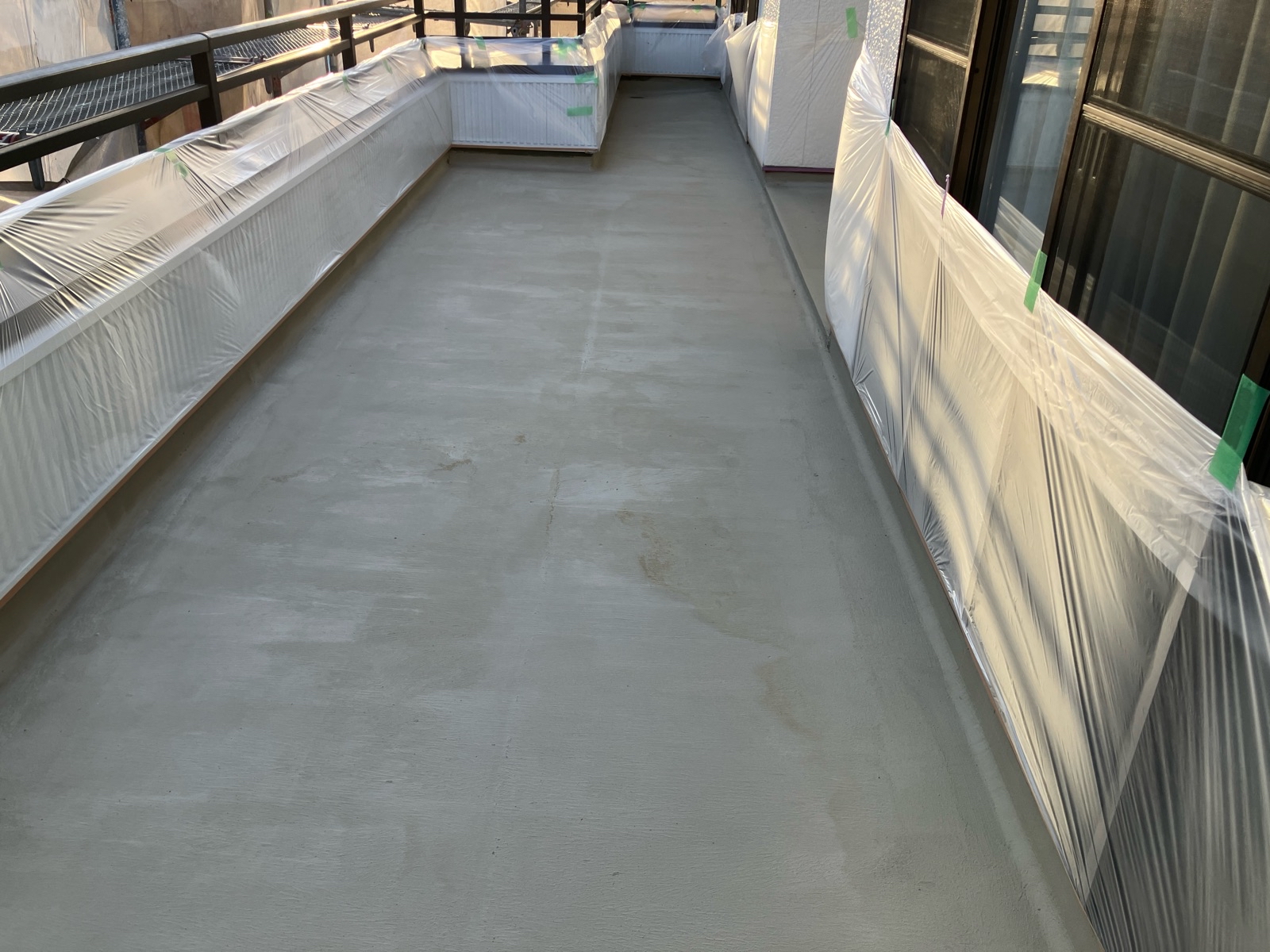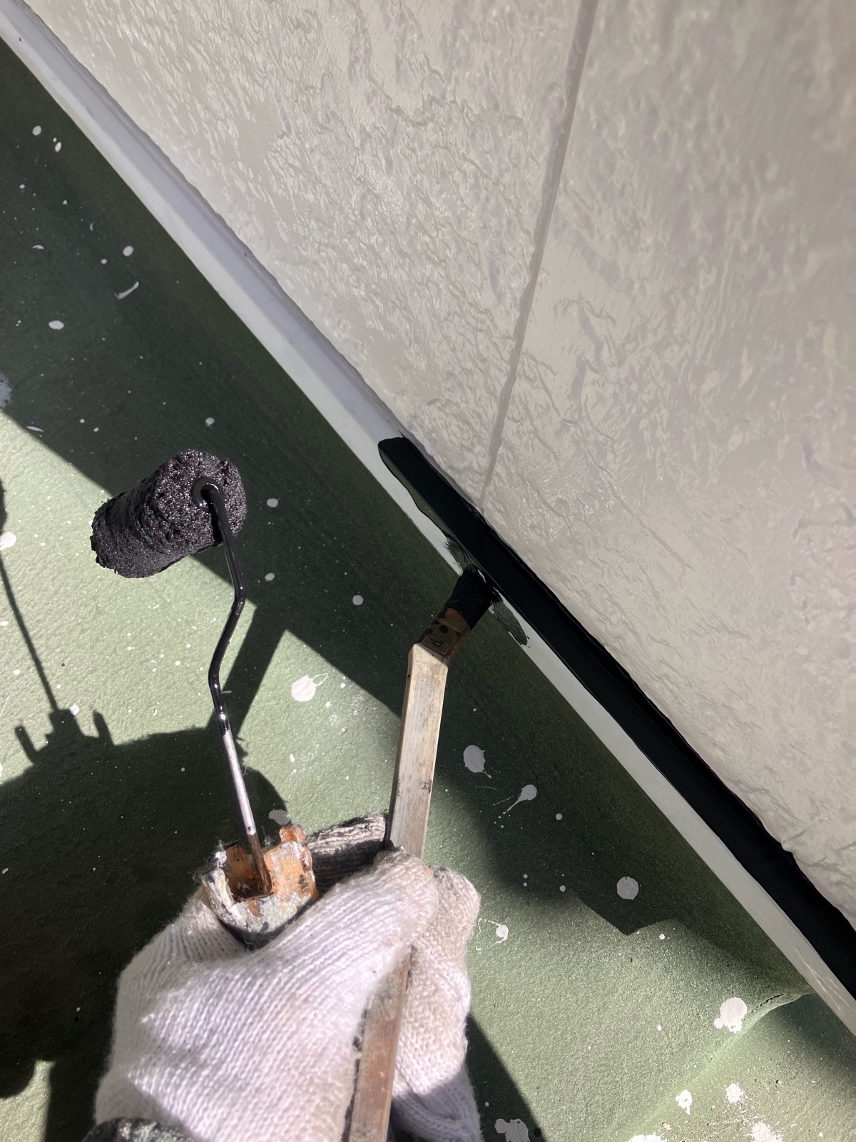 ベランダ部分は雨漏りのリスクが高い箇所であるため、今回は表面の防水塗装(ウレタン防水)だけでなく、壁面にカバー工法を施すことで防水性能を根本から強化しています。