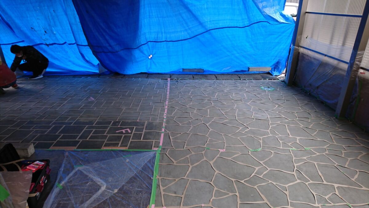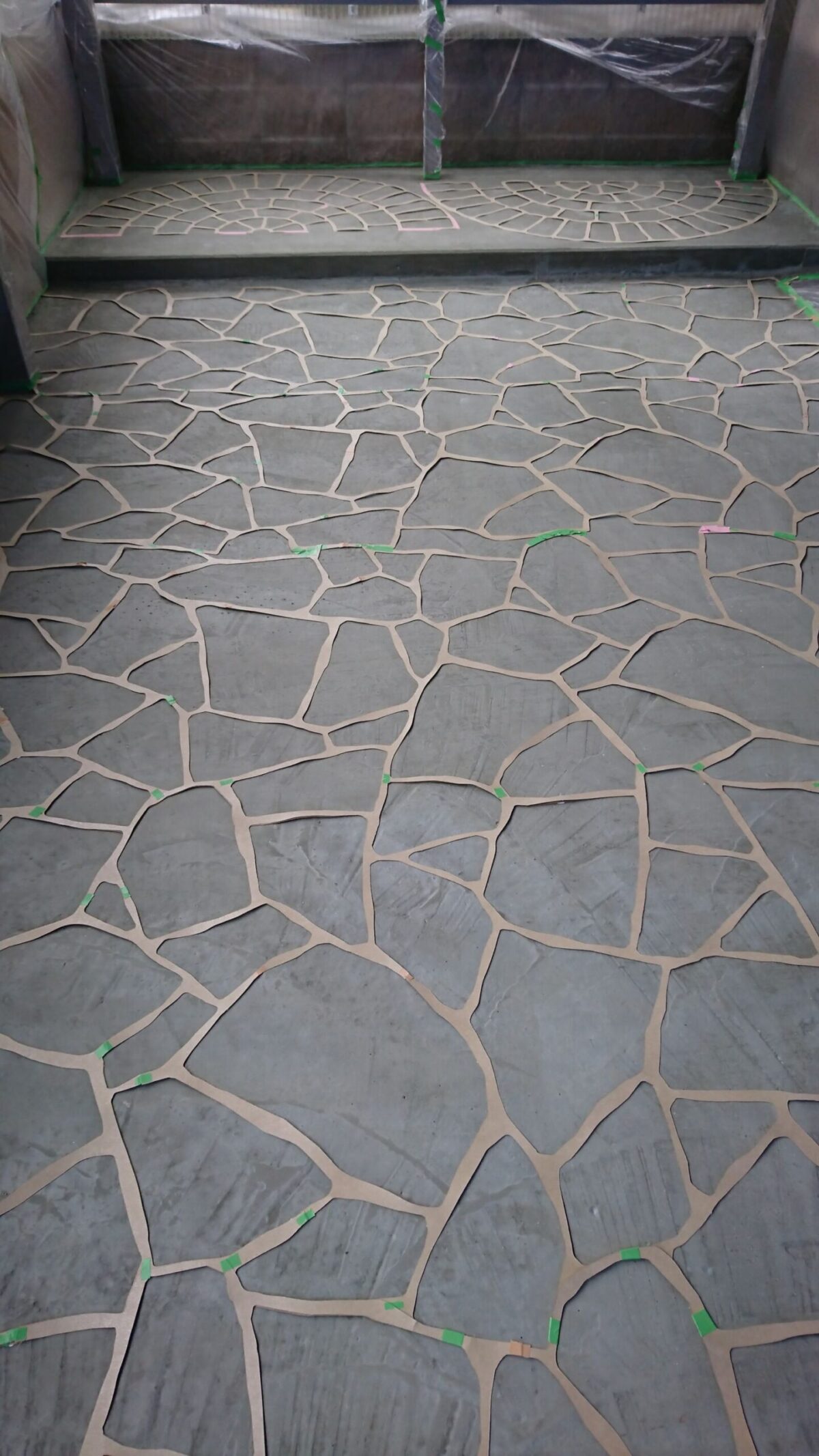 土間に模様の入った専用の厚紙を貼り付けていく