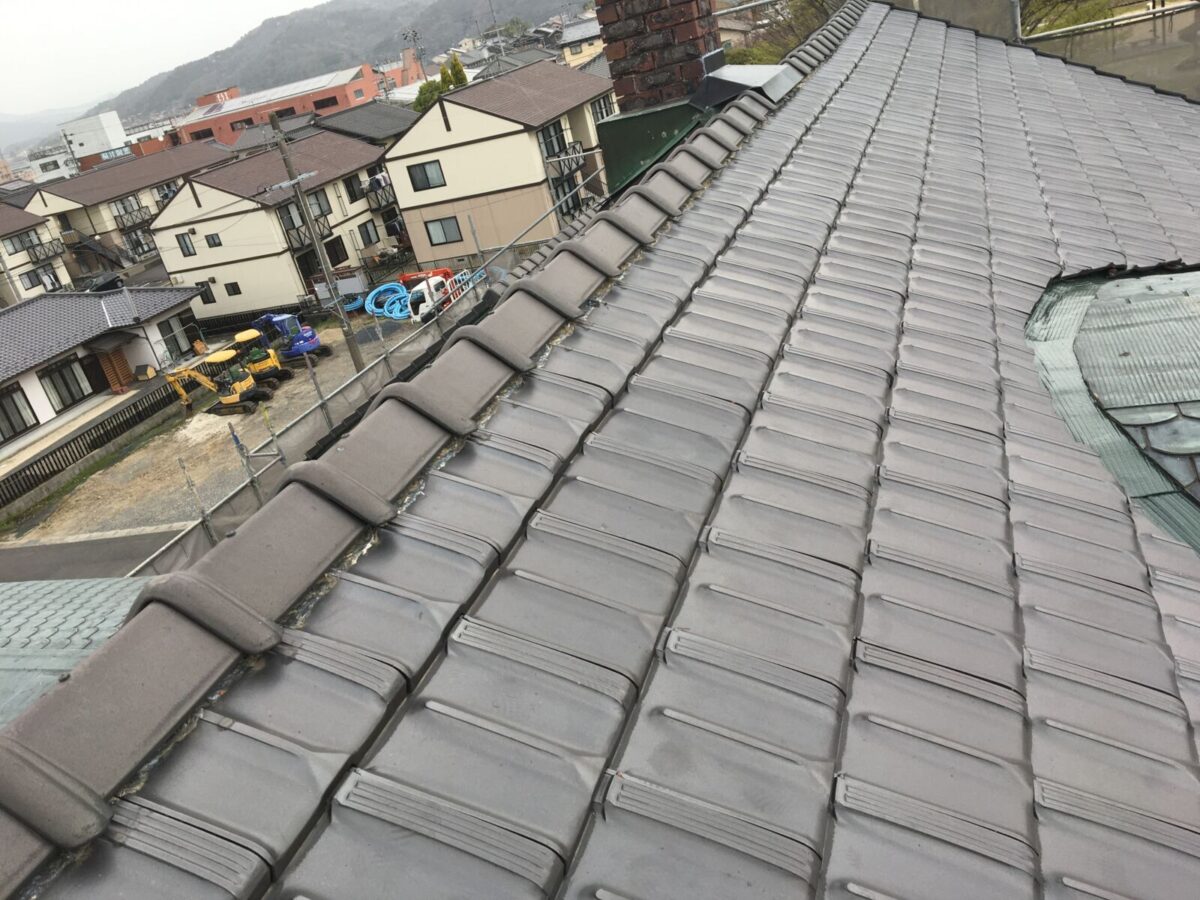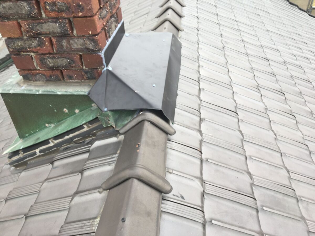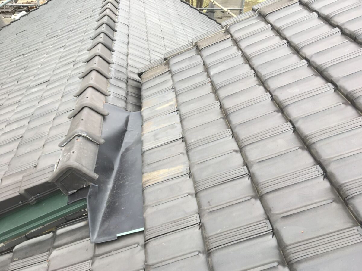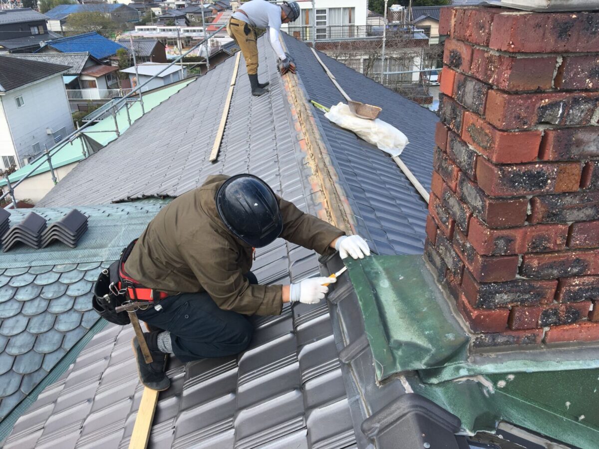 外壁の塗装工事は大体終わりましてこの際屋根も一緒に直しておきたいわ、という事で屋根の棟の積みなおし工事と谷樋の板金の交換も施工させていただいております!
