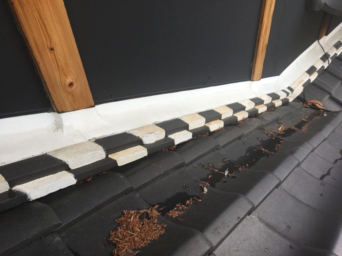 のし瓦の下に落ち葉がかなり詰まっておりました。はっぱを掻き出してジョウロを使って水をかけました。