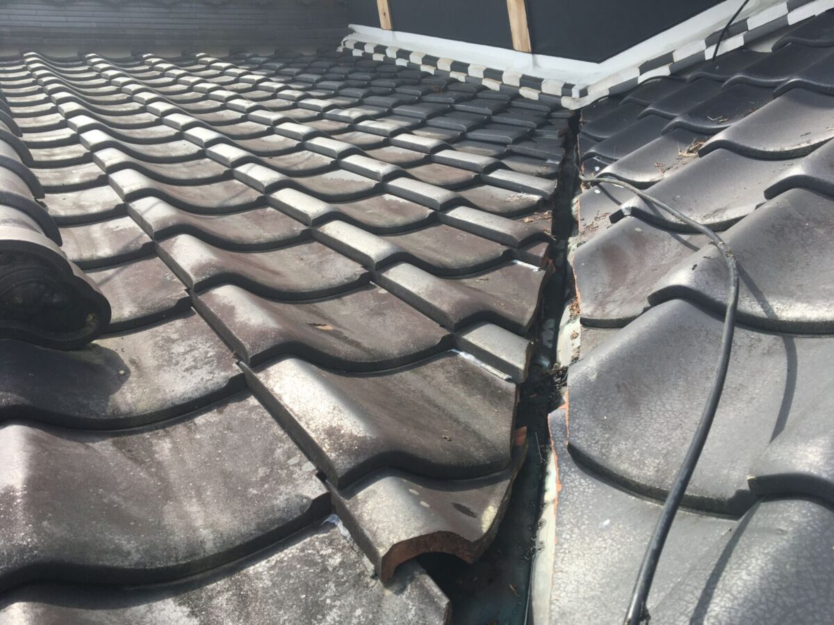 とても立派なたたずまいの和風なお宅でした。和風のお宅って雨漏り多い気がします。入り組んだ屋根、木、漆喰、モルタル、銅板などなどいろいろな素材のつなぎ目部分や、雨漏りするところも色々ありますが縁側の天井に雨染み、入母屋になっている玄関上からの雨漏り、などなどいろいろありますが大体漏れてくる部位が似ております。そして2階部分が1階部分より小さくなっており2階の外周回りの下に漏れてくる症状もよく見ます。そしてこちらのお宅も2階の壁のラインで一階に雨漏りしておりました。屋根に上りすぐに怪しいところを発見。