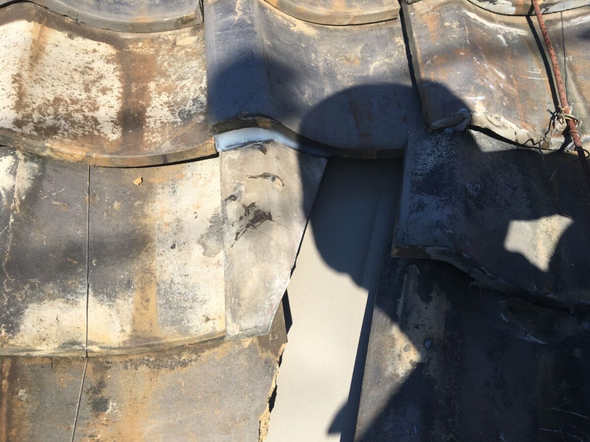 真ん中に見える銀色の部分が谷トイといわれる板金の雨が流れていくところになります。その左側の瓦が落ちてしまいそうになっておりましたので今回お客様も慌てて怖い怖いということで補修の工事に入りました!