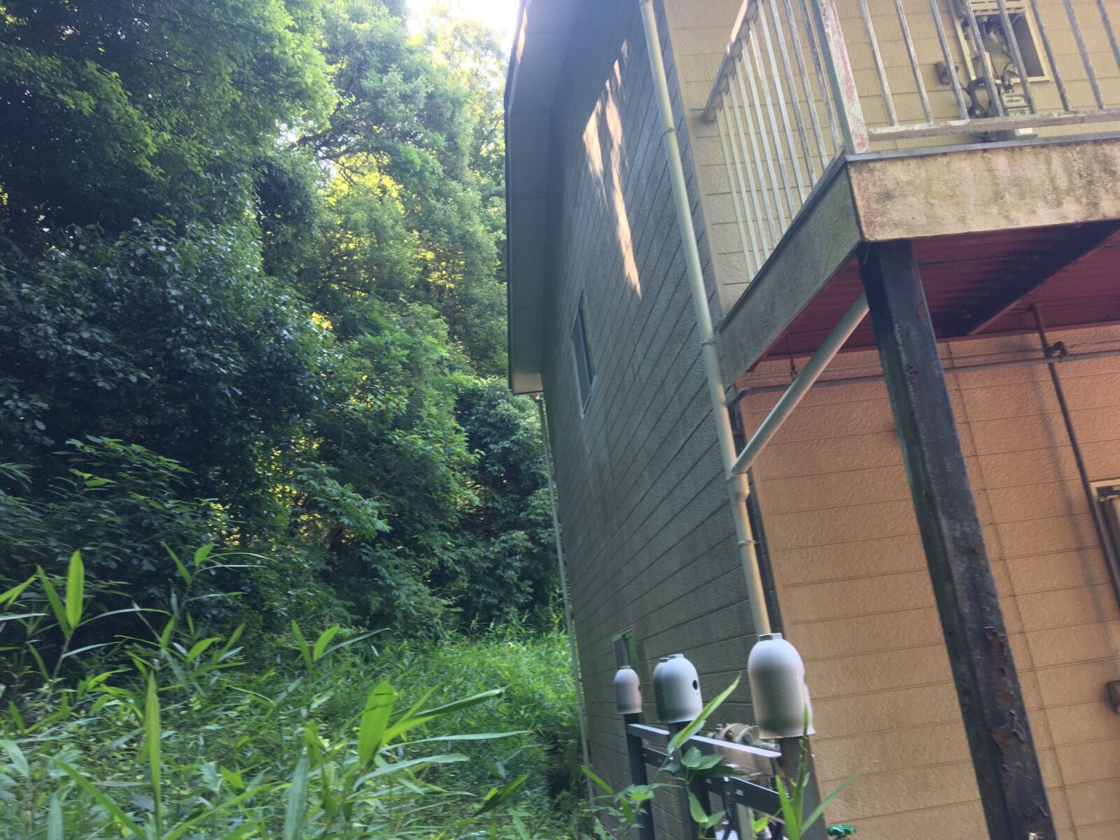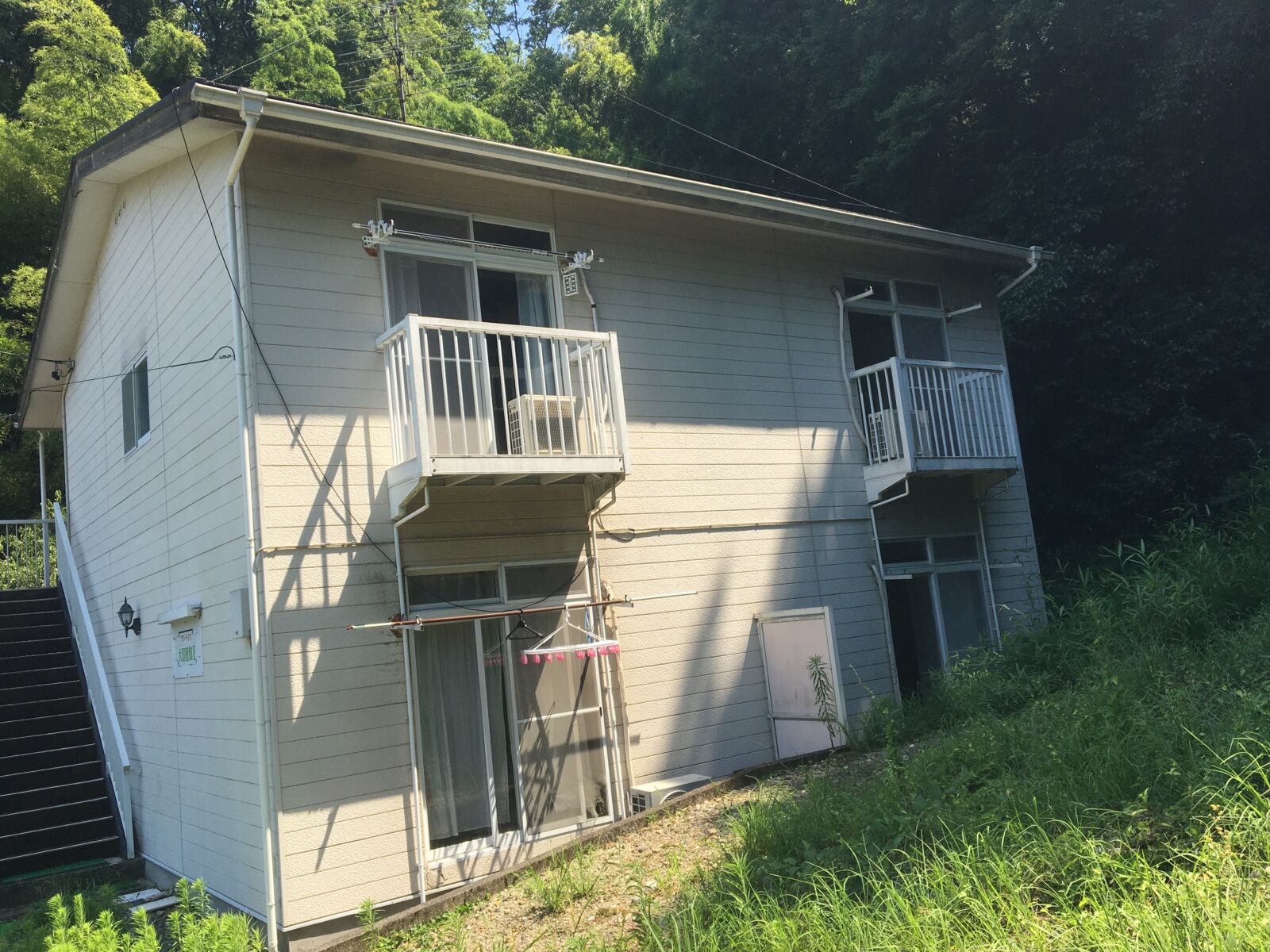 2棟並んでおります。山が近いということもありまして一面はコケが多く生えてしまっております。コケ、カビの中には塗膜を食べてしまうような物もおりますので生えすぎは要注意です!塗装の際には防カビ材を添加したいと思います(^^♪