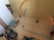 - 大工さんの後ろでは配管をやりました。 狭い所に潜り込んでの作業は大変ですがなんとかキッチリ! クロスを貼って器具を取り付けます。