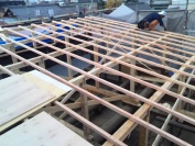 - 下地板を張ったらルーフィング(防水紙)を張っていきます。 ここまで来たら雨漏りも一応一安心(^_-)-☆ 最初よりは雨漏りしない屋根になりました。