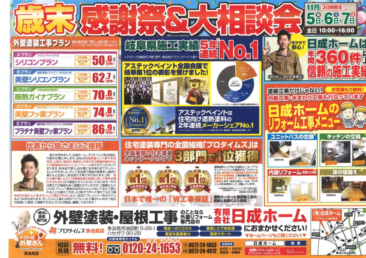 多治見市池田町 日成ホーム 外壁屋根塗装工事 リフォーム 板金工事 防水工事 プロタイムズ多治見店 ショールーム チラシ 広告 イベント 感謝祭 相談会